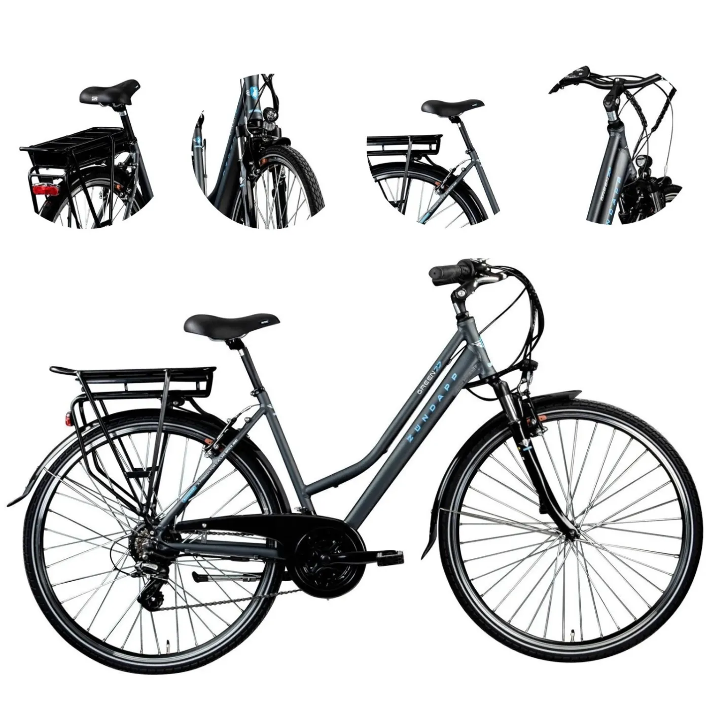 💎 Podstawową konstrukcją e-roweru jest lekka rama diamentowa wykonana z aluminium, która jest połączona z widelcem amortyzowanym o skoku zawieszenia 63 mm. W połączeniu z kierownicą miejską z tylną korbą i mostkiem z regulacją kąta, rower zapewnia wygodną pozycję siedzącą, która pozwala jeździć przez długi czas bez objawów zmęczenia. Możesz też długo wytrzymać na wygodnym siodle.