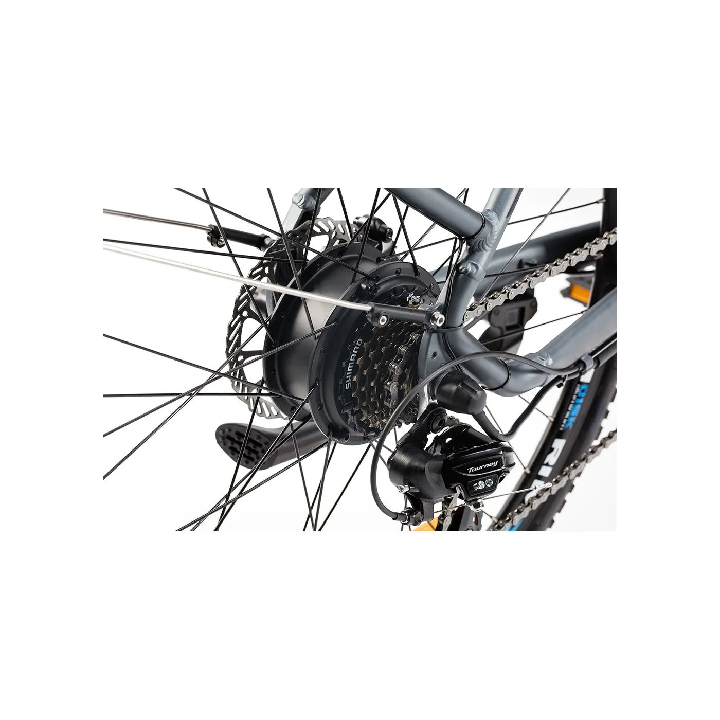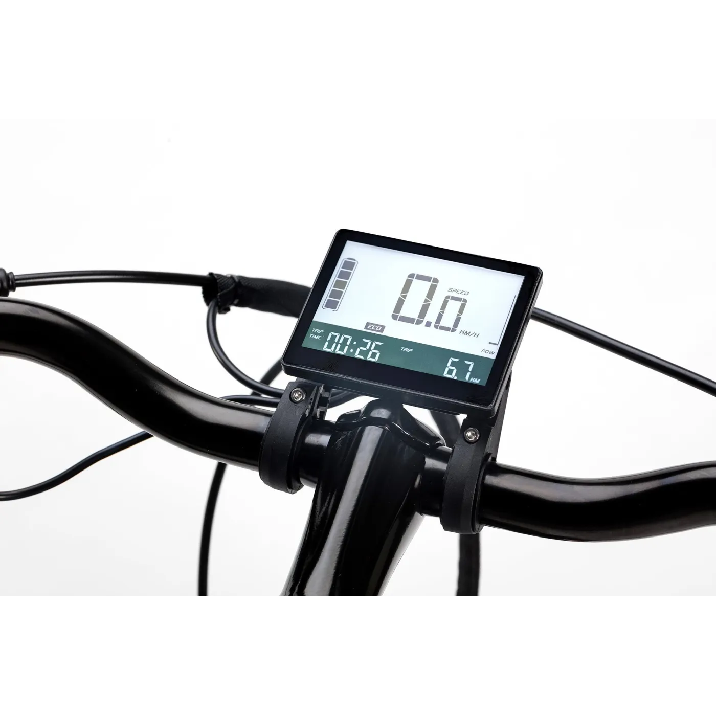 System wspomagania pedałowania oferuje 4 poziomy wspomagania, a wyświetlacz LCD podaje nam informacje o pojemności akumulatora, poziomie wspomagania, prędkości, całkowitym i częściowym dystansie. Dla większego komfortu bateria jest zintegrowana z ramą i jest wyjmowana. Zawiera 7-biegową skrzynię biegów Shimano, przednie zawieszenie z widelcem Suntour NEX - dla jeszcze większego komfortu jazdy. Czas ładowania to 4 godziny, a po pełnym naładowaniu umożliwia nam przejechanie do 120 km z maksymalną prędkością 25 km/h.