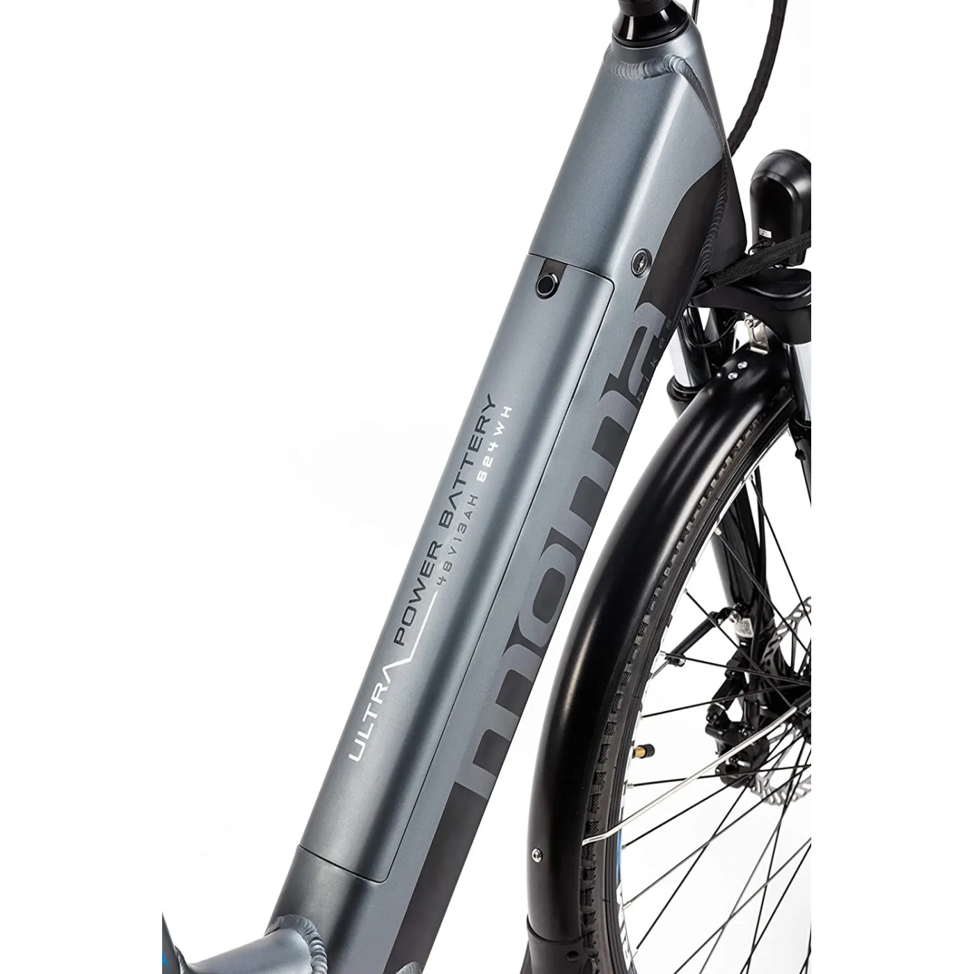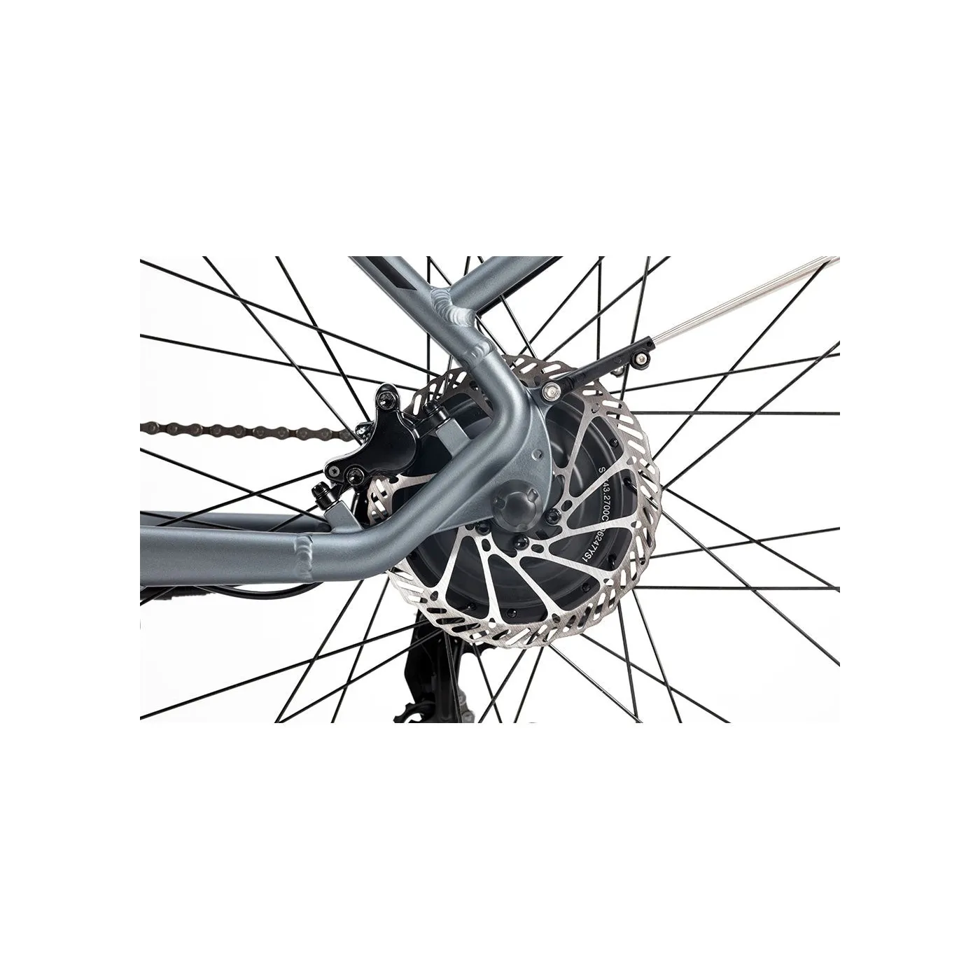 System wspomagania pedałowania oferuje 4 poziomy wspomagania, a wyświetlacz LCD podaje nam informacje o pojemności akumulatora, poziomie wspomagania, prędkości, całkowitym i częściowym dystansie. Dla większego komfortu bateria jest zintegrowana z ramą i jest wyjmowana. Zawiera 7-biegową skrzynię biegów Shimano, przednie zawieszenie z widelcem Suntour NEX - dla jeszcze większego komfortu jazdy. Czas ładowania to 4 godziny, a po pełnym naładowaniu umożliwia nam przejechanie do 120 km z maksymalną prędkością 25 km/h.