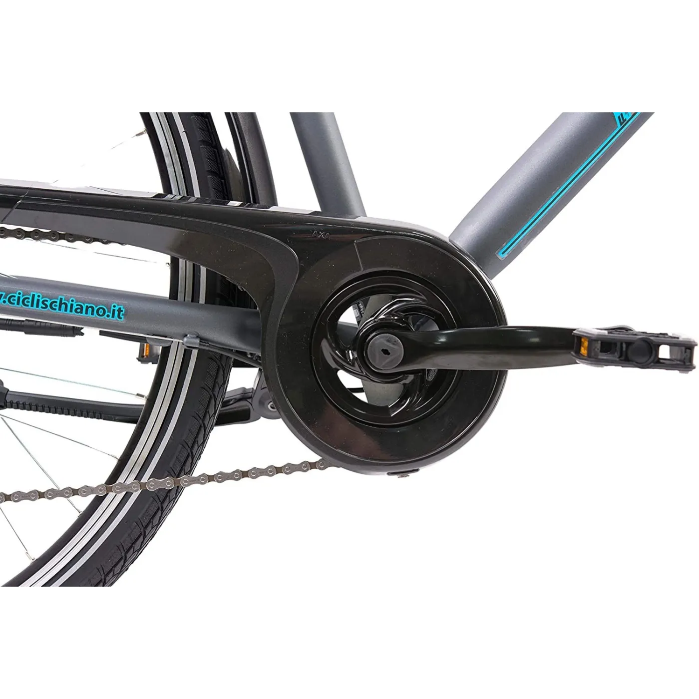 Stalowa rama z regulowanym mocowaniem na kierownicę, która pozwala na utrzymanie wygodnej pozycji w czasie jazdy, z kierownicą do rowerów miejskich / trekkingowych. Mocny tylny silnik 250 W, który zapewnia długą żywotność i wysoką wydajność oraz który może osiągnąć maksymalną prędkość do 25 km / h. Bateria 36V/ 13Ah/ 481Wh, wygodnie umieszczona pod bagażnikiem pozwala na pokonanie 80 km dystansu w trybie eco. Rower posiada trzy tryby wspomagania, przez co świetnie sprawdzi się w zróżnicowanym terenie.