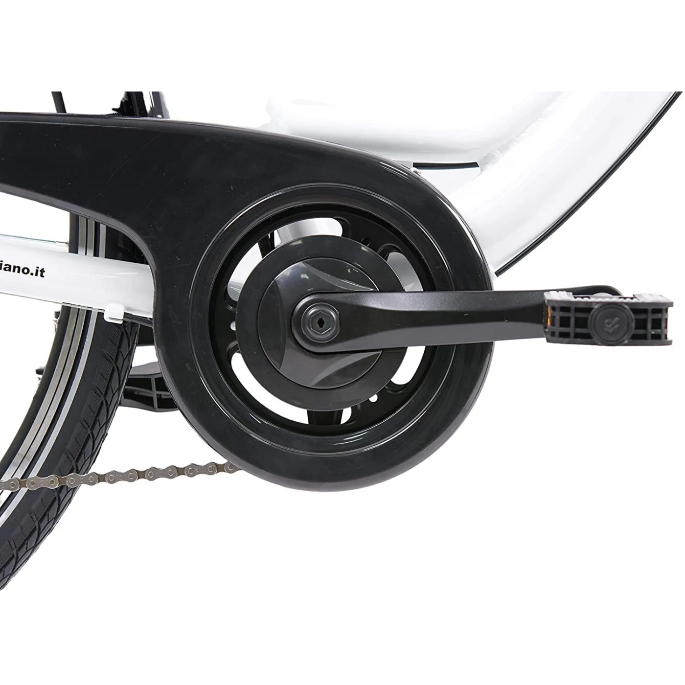 Silnik o mocy 250W oraz akumulator o pojemności 13Ah pozwala na pokonanie nawet do 80 km! (w zależności od wagi użytkownika, warunków i trybu jazdy) Bateria umieszczona jest pod bagażnikiem, dzięki czemu rower nie traci miejsca do transportu bagażu. Dodatkowym atutem jest komfortowa pozycja jazdy, którą zapewnia wygodne siodełko i szeroka kierownica. Rower wyposażony jest w 7 biegów, co ułatwia podróżowanie po zróżnicowanym terenie oraz dwa hamulce V-brake. E-Moon posiada wszystkie potrzebne akcesoria, tj. błotniki, stopkę i oświetlenie oraz dzwonek - zapewniając tym bezpieczeństwo jazdy.