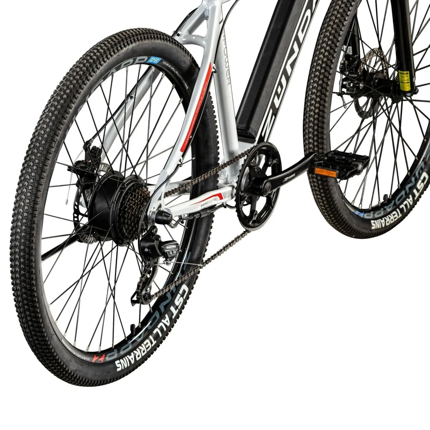 E-rower ma również napęd łańcuchowy z 7 biegami. Jeśli chcesz jeździć bez silnika, możesz zrobić duże postępy. Zamontowano tylną przerzutkę Shimano Tourney, mechanizm korbowy firmy Prowheel i łańcuch KMC X8. Biegi można łatwo wybierać za pomocą dźwigni zmiany biegów Shimano Tourney.