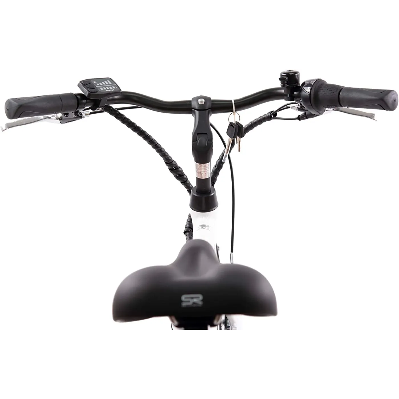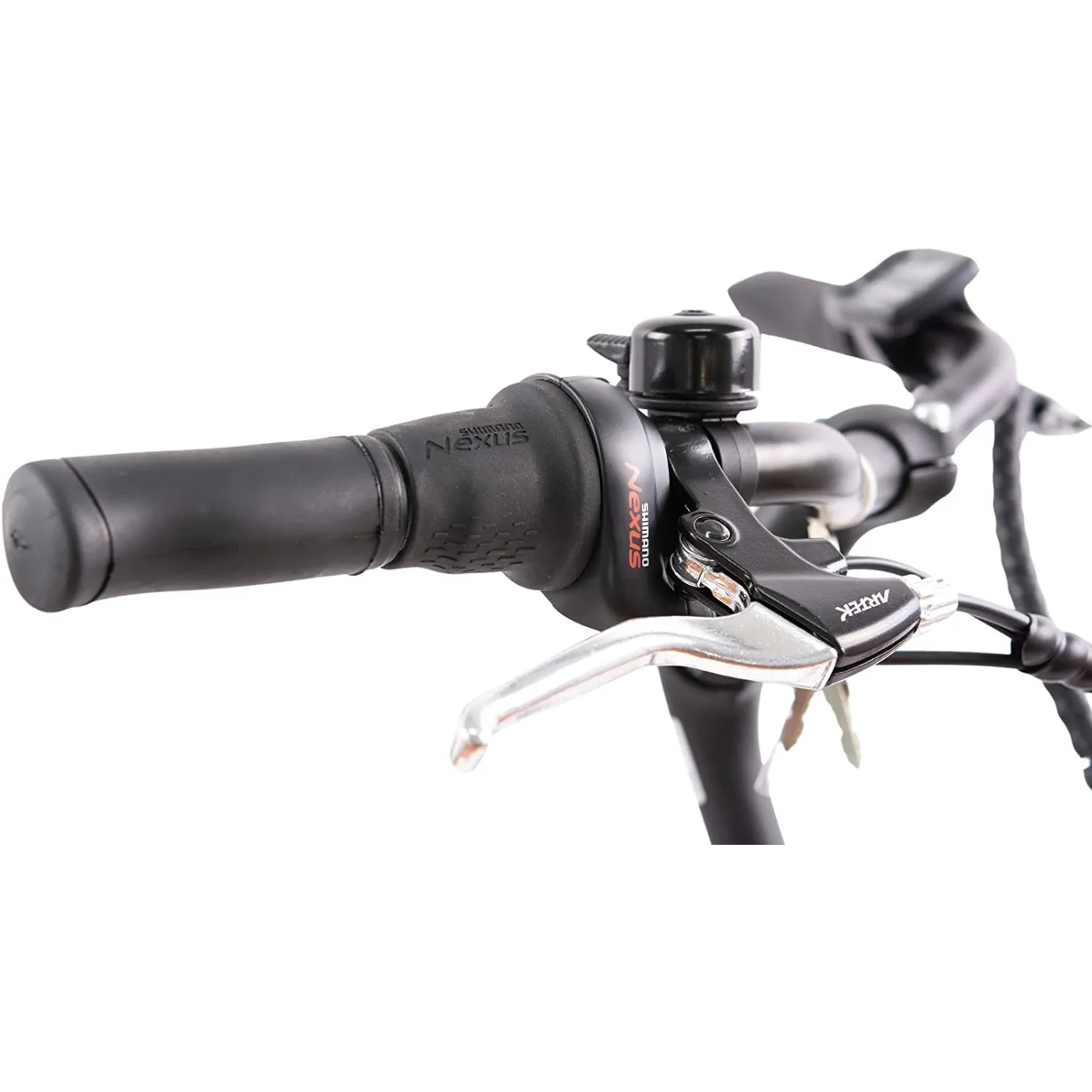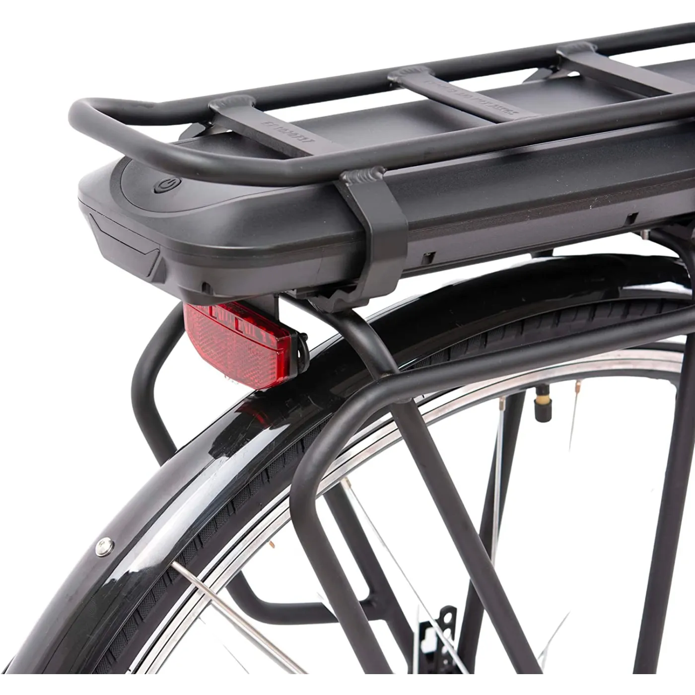 Silnik o mocy 250W oraz akumulator o pojemności 13Ah pozwala na pokonanie nawet do 100 km! (w zależności od wagi użytkownika, warunków i trybu jazdy). Bateria umieszczona jest pod bagażnikiem, dzięki czemu rower nie traci miejsca do transportu bagażu. Dodatkowym atutem jest komfortowa pozycja jazdy, którą zapewnia wygodne siodełko i szeroka kierownica. Rower wyposażony jest w 7-biegową przekładnię w piaście oraz dwa hamulce V-brake.