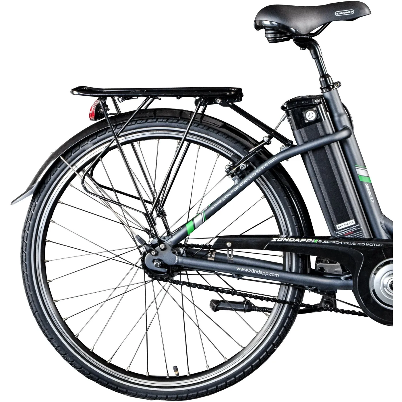Zündapp Green 3.7 jest idealnie przystosowany do ruchu ulicznego i codziennego użytku. Przede wszystkim oświetlenie zgodne z StVZO ze światłami LED AXA z przodu i z tyłu. Osłona łańcucha, błotniki i stopka boczna są również fabrycznie częścią roweru.