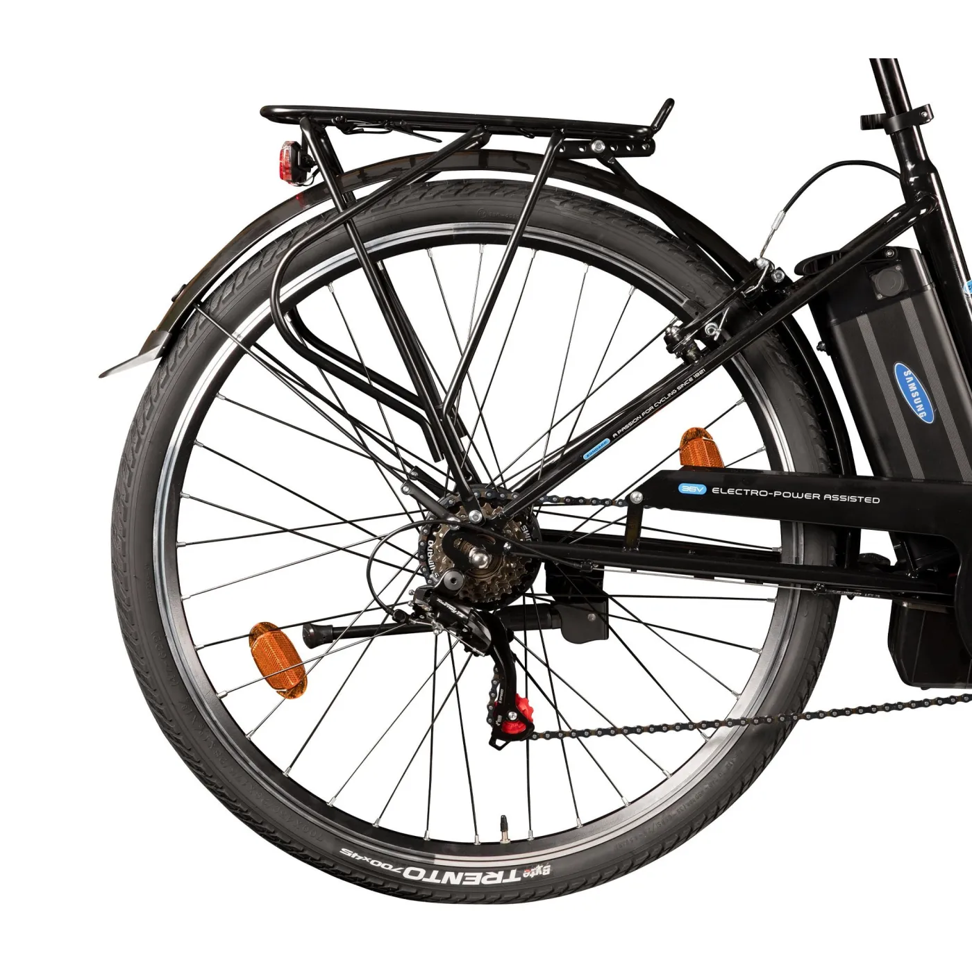 Rower elektryczny jest wyposażony we wszystko, czego potrzebujesz w życiu codziennym. Oprócz bocznej stopki i osłony łańcucha posiada błotniki, bagażnik oraz oświetlenie.