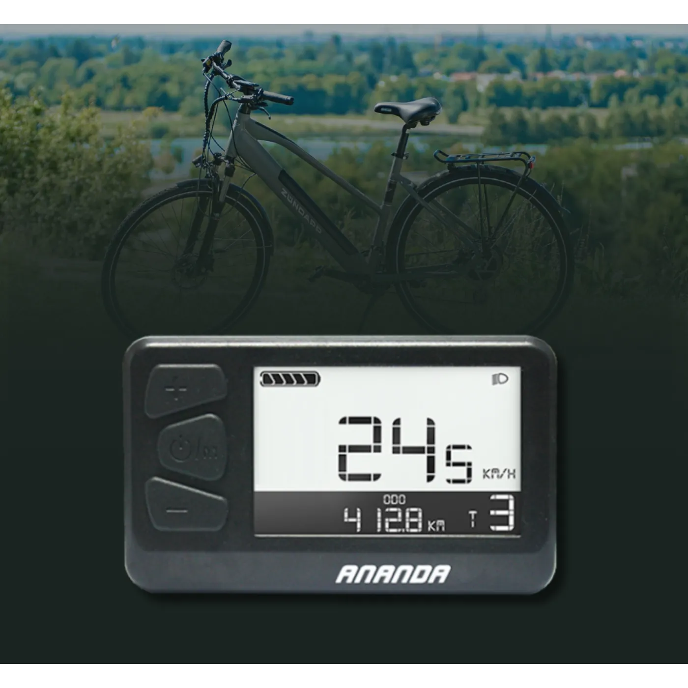 🔋 Mocny silnik piasty koła Ananda na tylnym kole zapewnia delikatne podparcie dzięki mocy 250 watów. Poziomy wsparcia są wybierane za pomocą przejrzystego wyświetlacza LCD Ananda D13, który zapewnia również pomoc w pchaniu i najważniejsze dane dotyczące jazdy. Ponieważ wyświetlacz znajduje się tuż obok lewego uchwytu, możesz go obsługiwać bez konieczności zdejmowania ręki z kierownicy. Dodatkowo, bateria o mocy 417,6Wh pozwoli Ci pokonać nawet do 125 km!