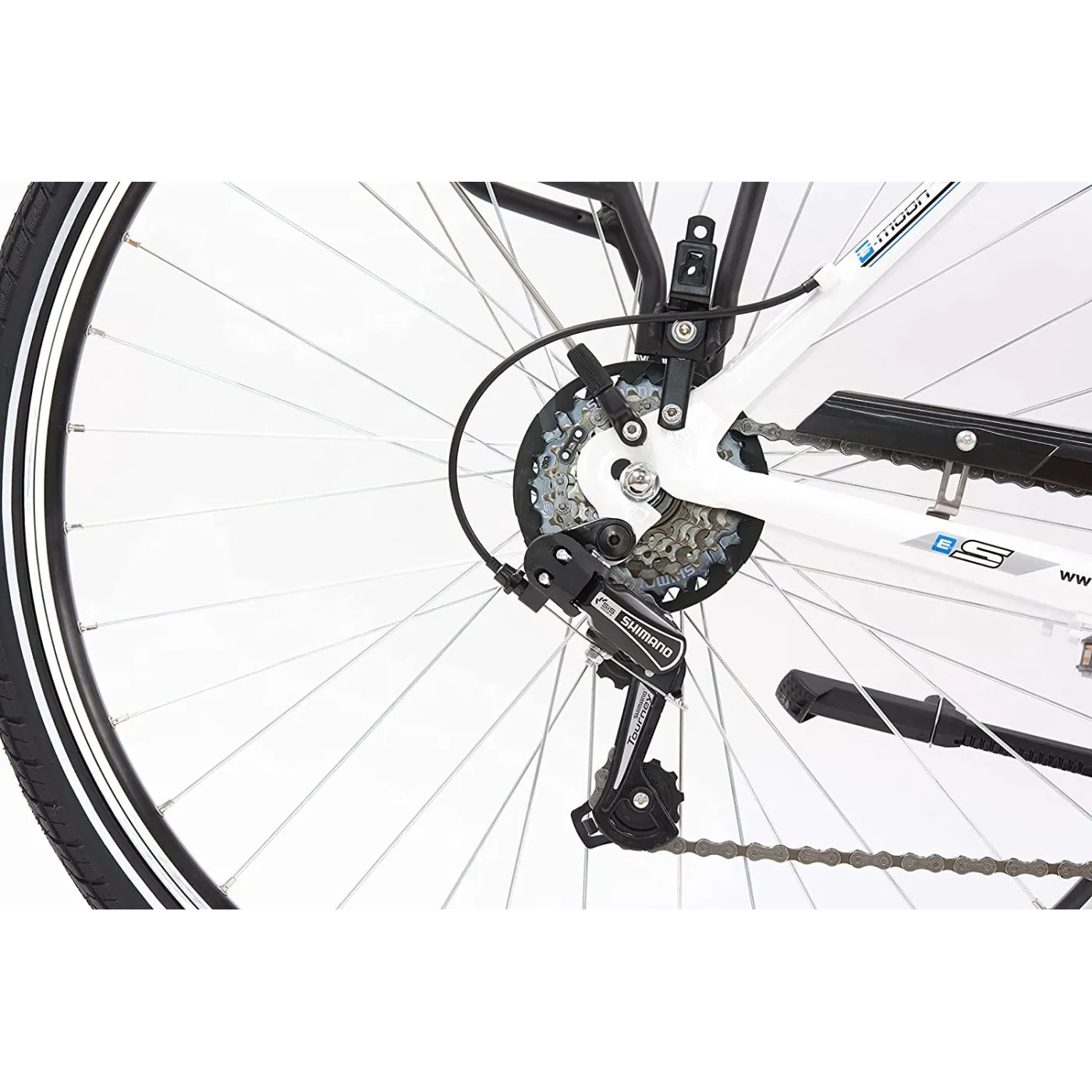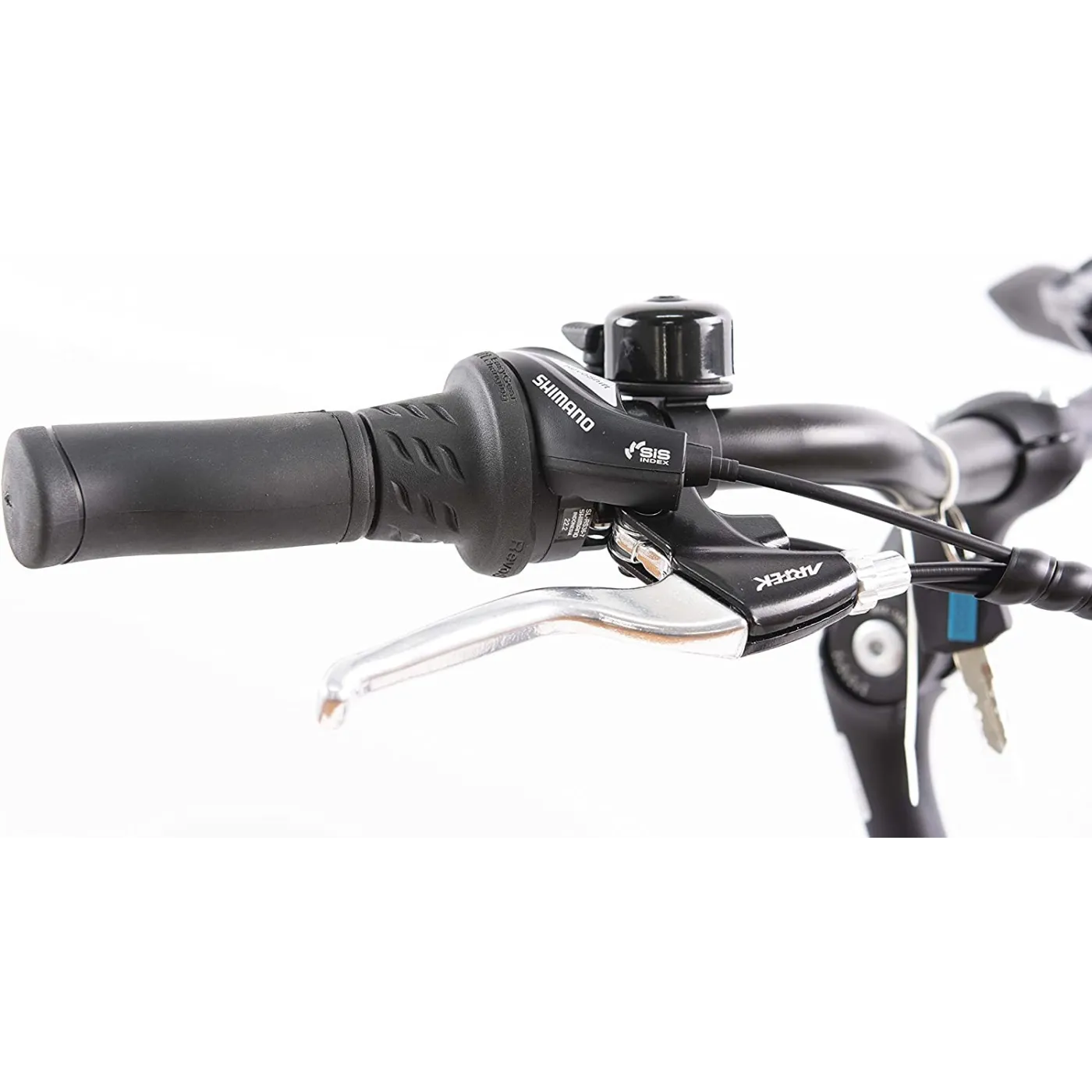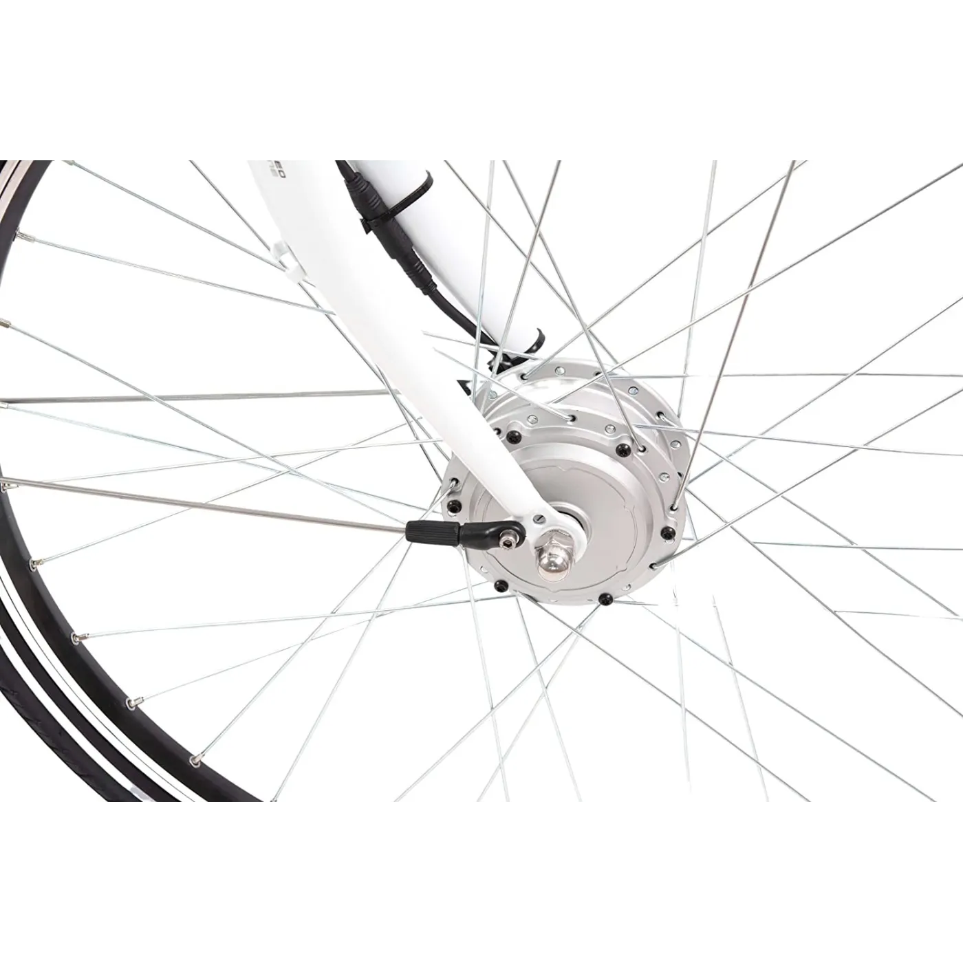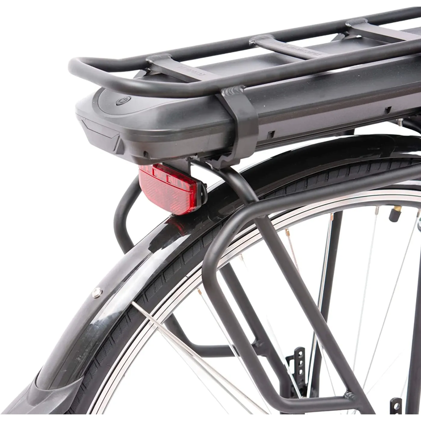 Silnik o mocy 250W oraz akumulator o pojemności 13Ah pozwala na pokonanie nawet do 100 km! (w zależności od wagi użytkownika, warunków i trybu jazdy). Bateria umieszczona jest pod bagażnikiem, dzięki czemu rower nie traci miejsca do transportu bagażu. Dodatkowym atutem jest komfortowa pozycja jazdy, którą zapewnia wygodne siodełko i szeroka kierownica. Rower wyposażony jest w 7-biegową przekładnię oraz dwa hamulce V-brake.