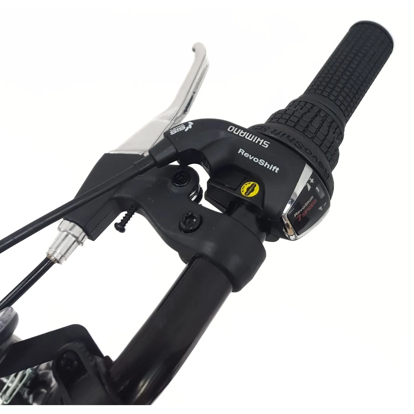 ⚙️ Rower został wyposażony w przerzutki Shimano – z przodu zastosowano klasyczne rozwiązanie trójrzędowe, a z tyłu pracuje niezawodna przerzutka Shimano Tourney. System ten pozwala na sprawne operowanie 21 biegami, co daje pełną kontrolę nad jazdą w każdych warunkach – zarówno podczas podjazdów, jak i na długich prostych trasach. Zmiana przełożeń odbywa się płynnie i szybko za pomocą obrotowych manetek Revoshift, co jest rozwiązaniem intuicyjnym nawet dla początkujących rowerzystów.