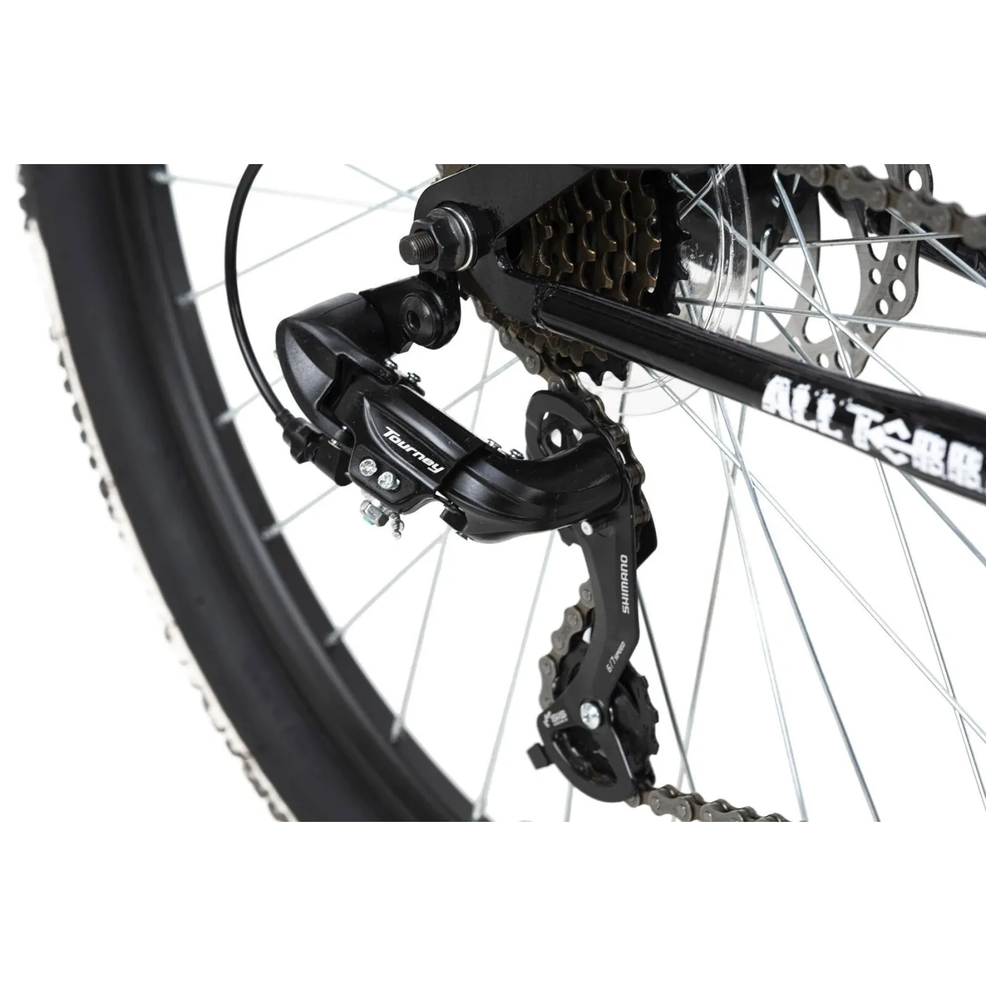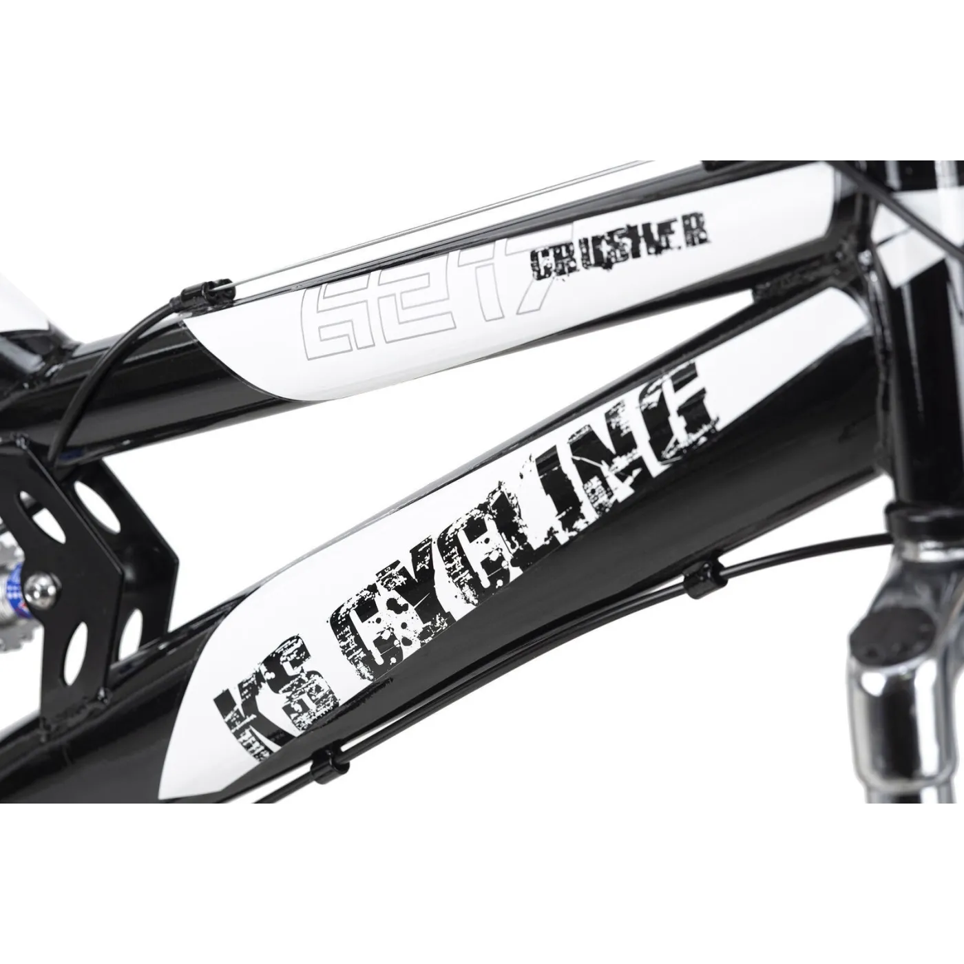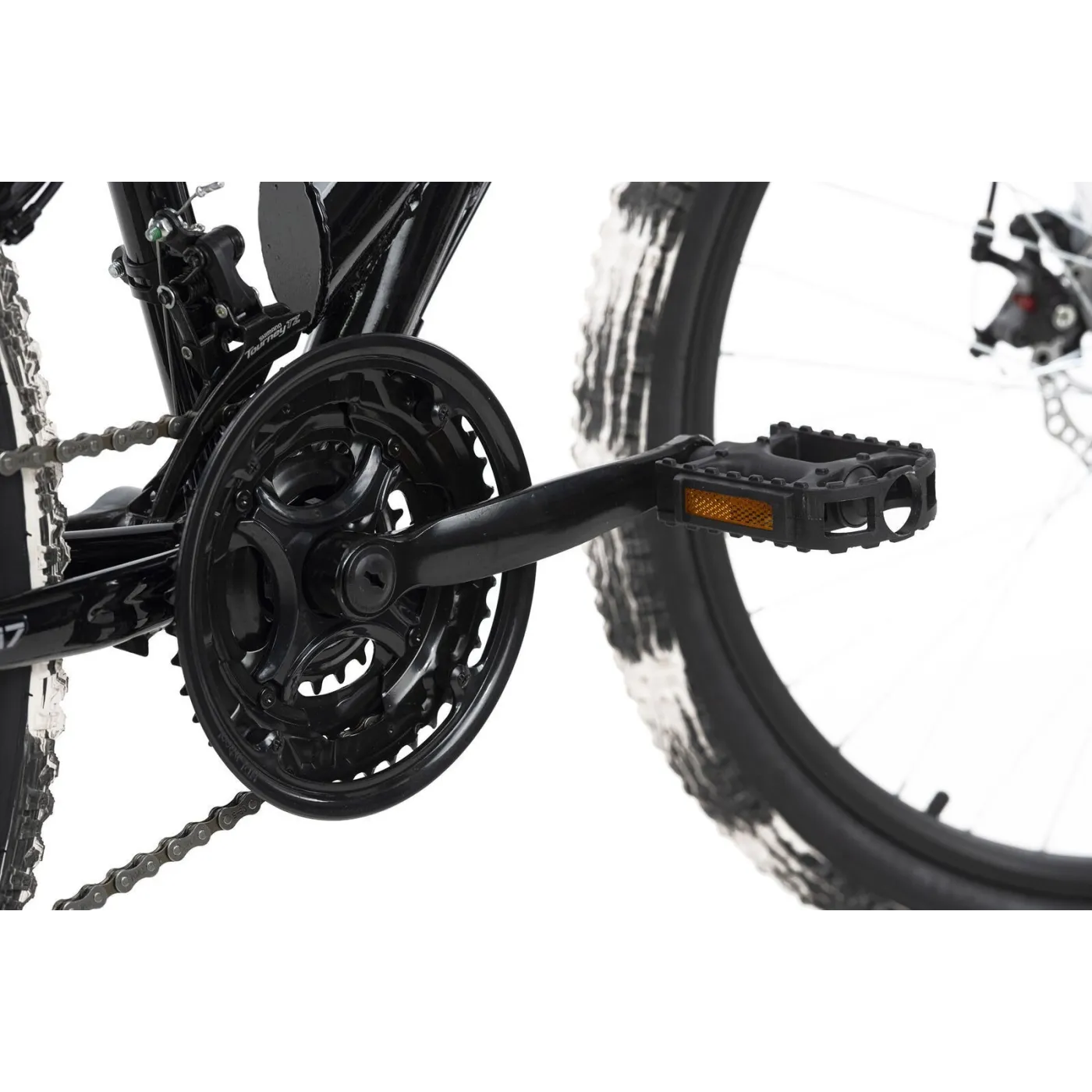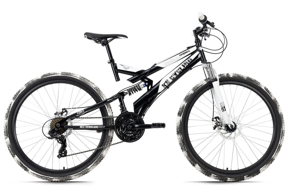 Rower MTB z pełnym zawieszeniem jest wyposażony w 21-biegową przerzutkę obsługiwaną za pomocą obrotowej dźwigni zmiany biegów. Mechaniczne hamulce tarczowe na przednich i tylnych kołach zapewniają dobre hamowanie. Opony Muddy White są również imponujące: malowanie zostało naniesione ręcznie na każdy egzemplarz - nie ma drugiej takiej samej opony - każda jest absolutnie wyjątkowa!