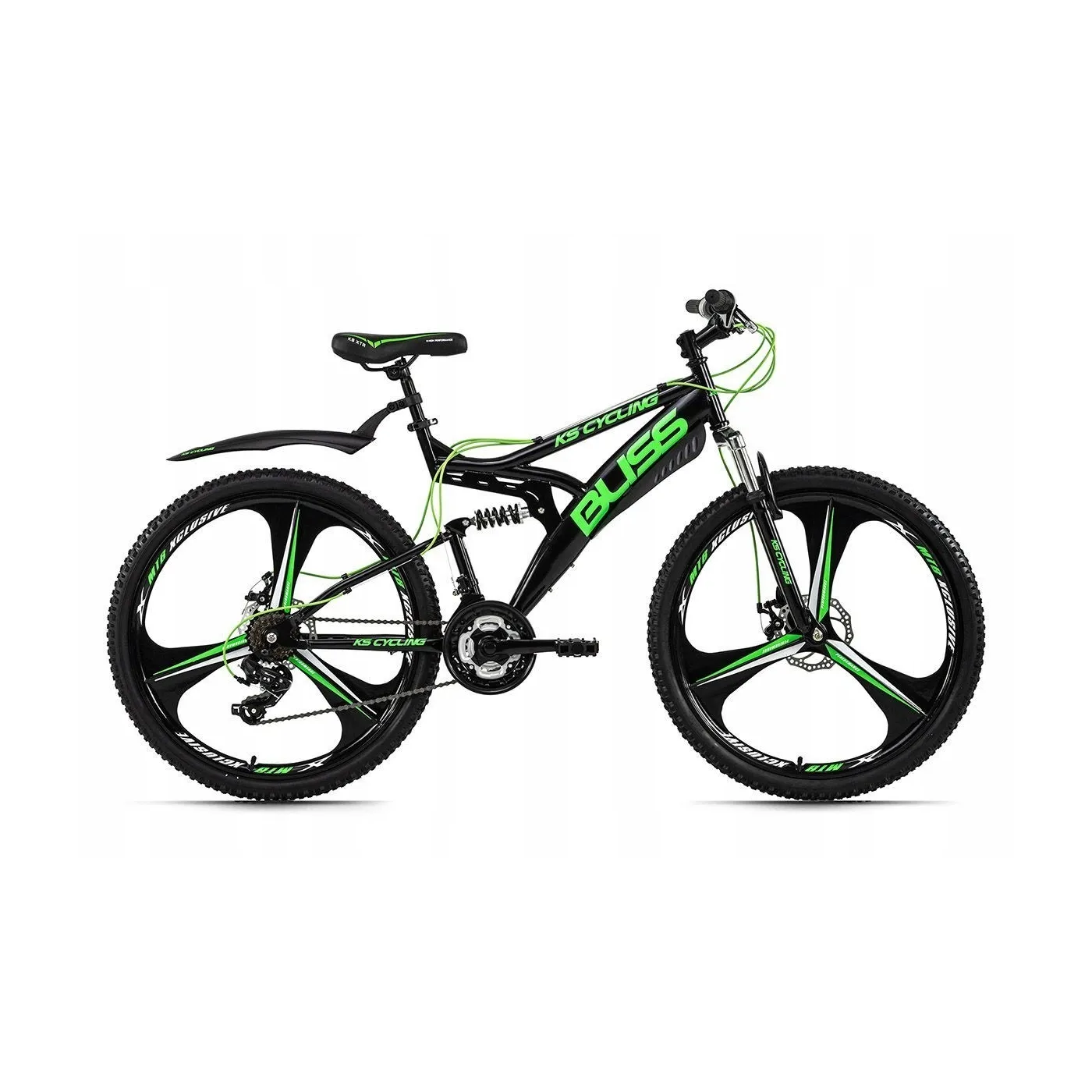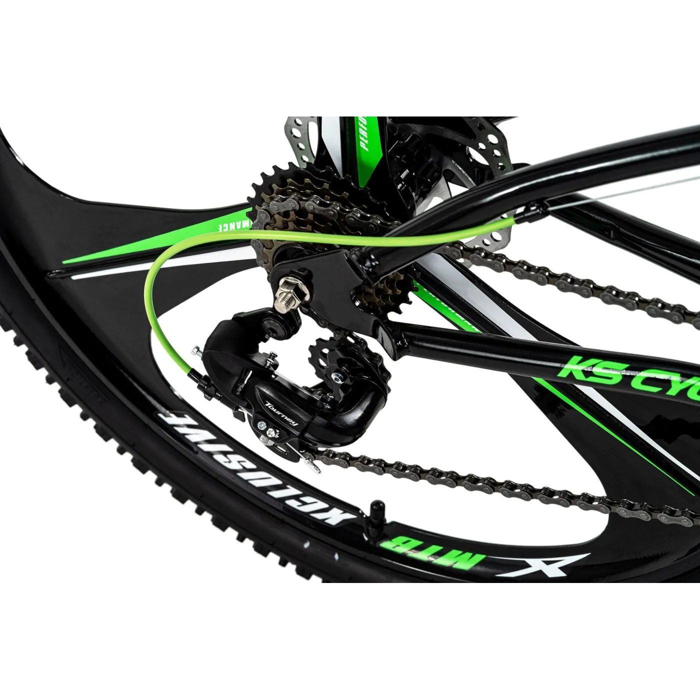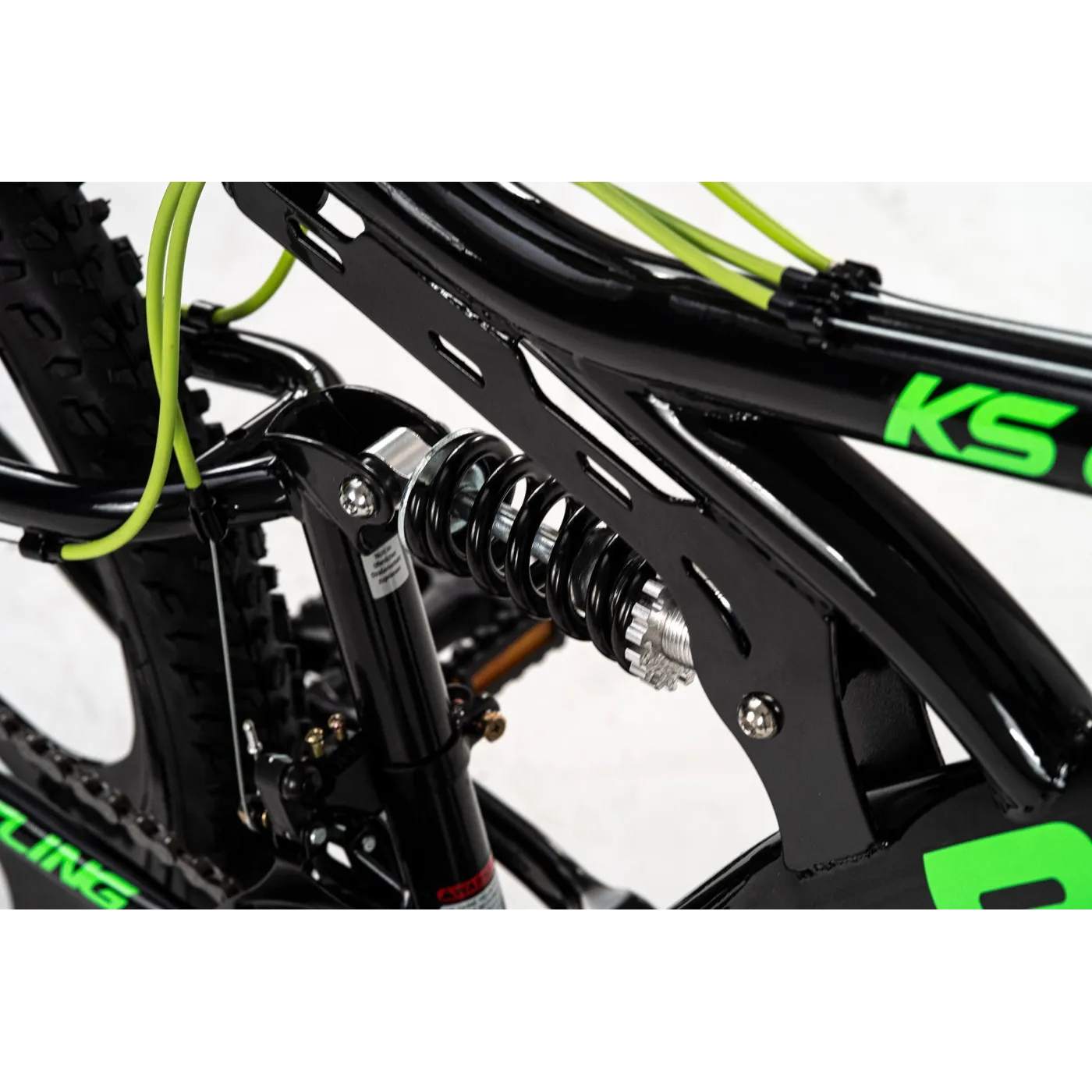 Wyrusz w przygodę na rowerze górskim z BLISS od KS Cycling! 26-calowy rower górski z pełnym zawieszeniem, w kolorze czarnym z naklejkami i kablami w kontrastującym kolorze zielonym. Ten niesamowity wygląd sprawia, że rower jest wszędzie w centrum uwagi!