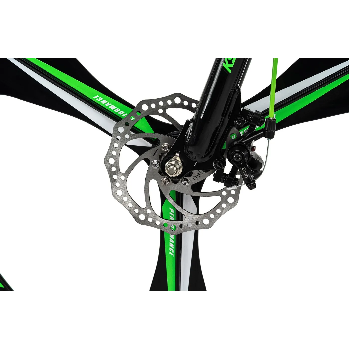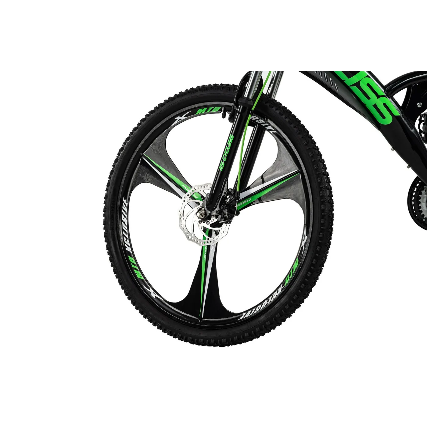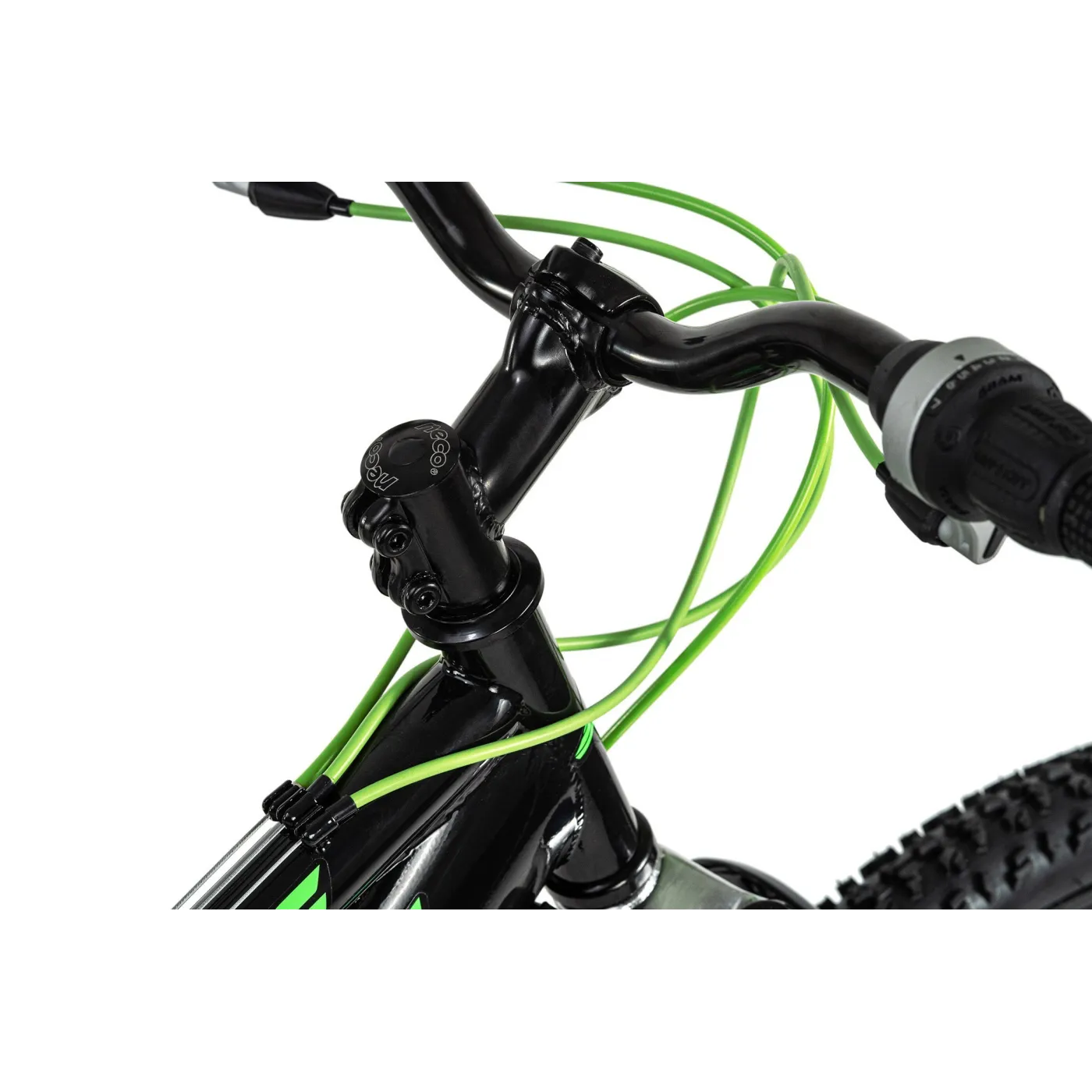 Wyrusz w przygodę na rowerze górskim z BLISS od KS Cycling! 26-calowy rower górski z pełnym zawieszeniem, w kolorze czarnym z naklejkami i kablami w kontrastującym kolorze zielonym. Ten niesamowity wygląd sprawia, że rower jest wszędzie w centrum uwagi!