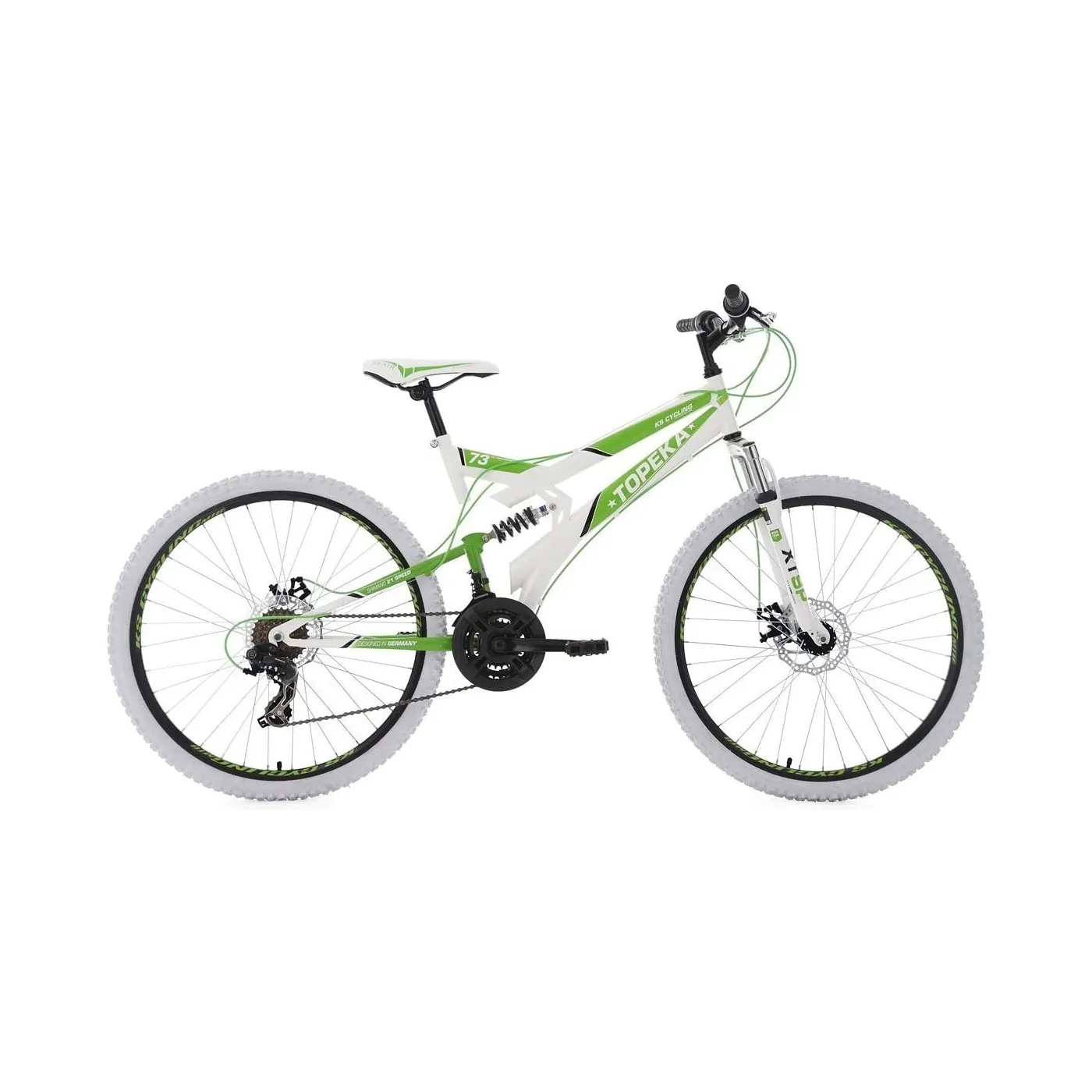 Doskonały rower górski od KS Cycling: 26-calowy w pełni amortyzorwany MTB TOPEKA został zaprojektowany z kolorowymi detalami na białej ramie. Białe opony sprawiają, że rower przyciąga wzrok. MTB z pełnym zawieszeniem jest wyposażony w 21-biegową przerzutkę Shimano. Produkt posiada mechaniczne hamulce tarczowe na przednich i tylnych kołach zapewniają dobre hamowanie oraz bezpieczeństwo podczas podróży. Dzięki ramie 26 calowej rower TOPEKA jest idealny zarówno dla mężczyzn, jak i kobiet.