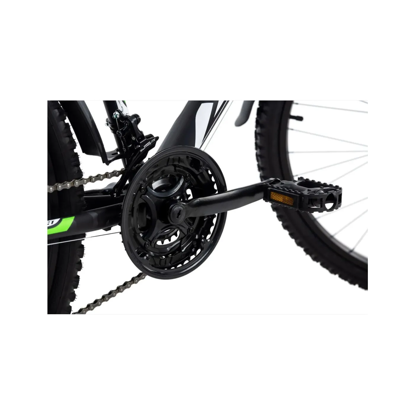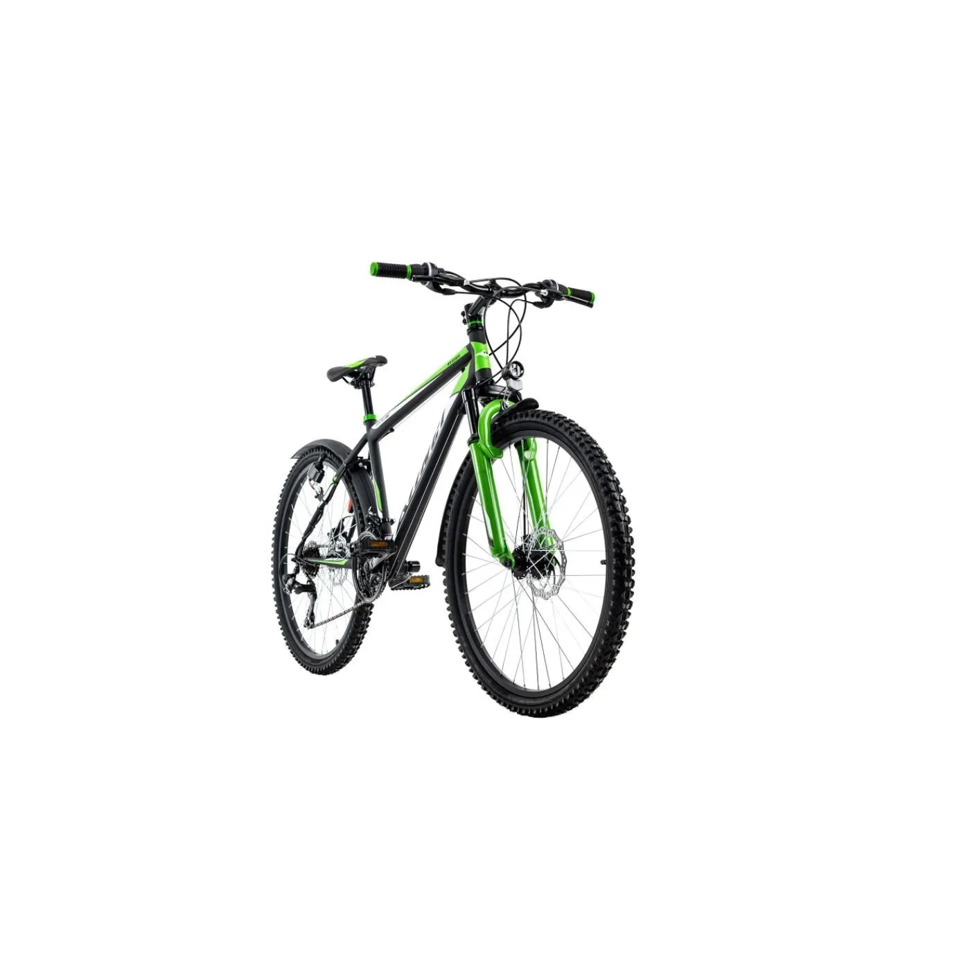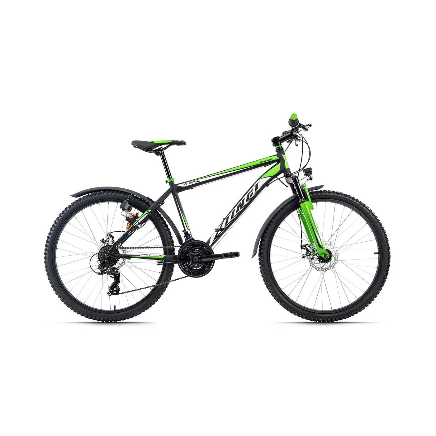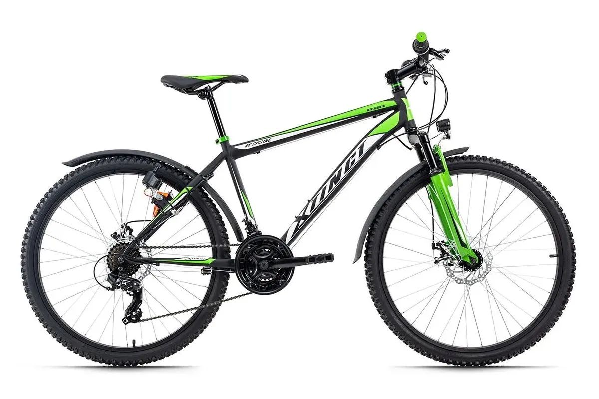 Zawsze gotowy do jazdy na pełnym gazie: czarny matowy rower górski XTINCT firmy KS Cycling zawsze prezentuje się znakomicie z naklejkami w kolorze zielonym i białym. Imponujące jest również wyposażenie eleganckiego roweru!