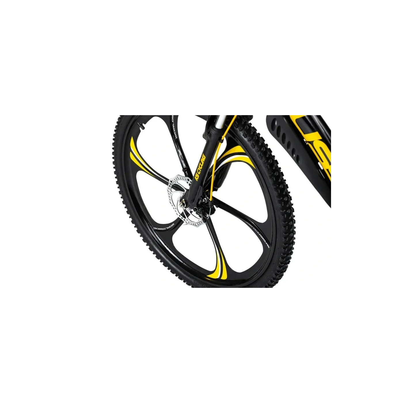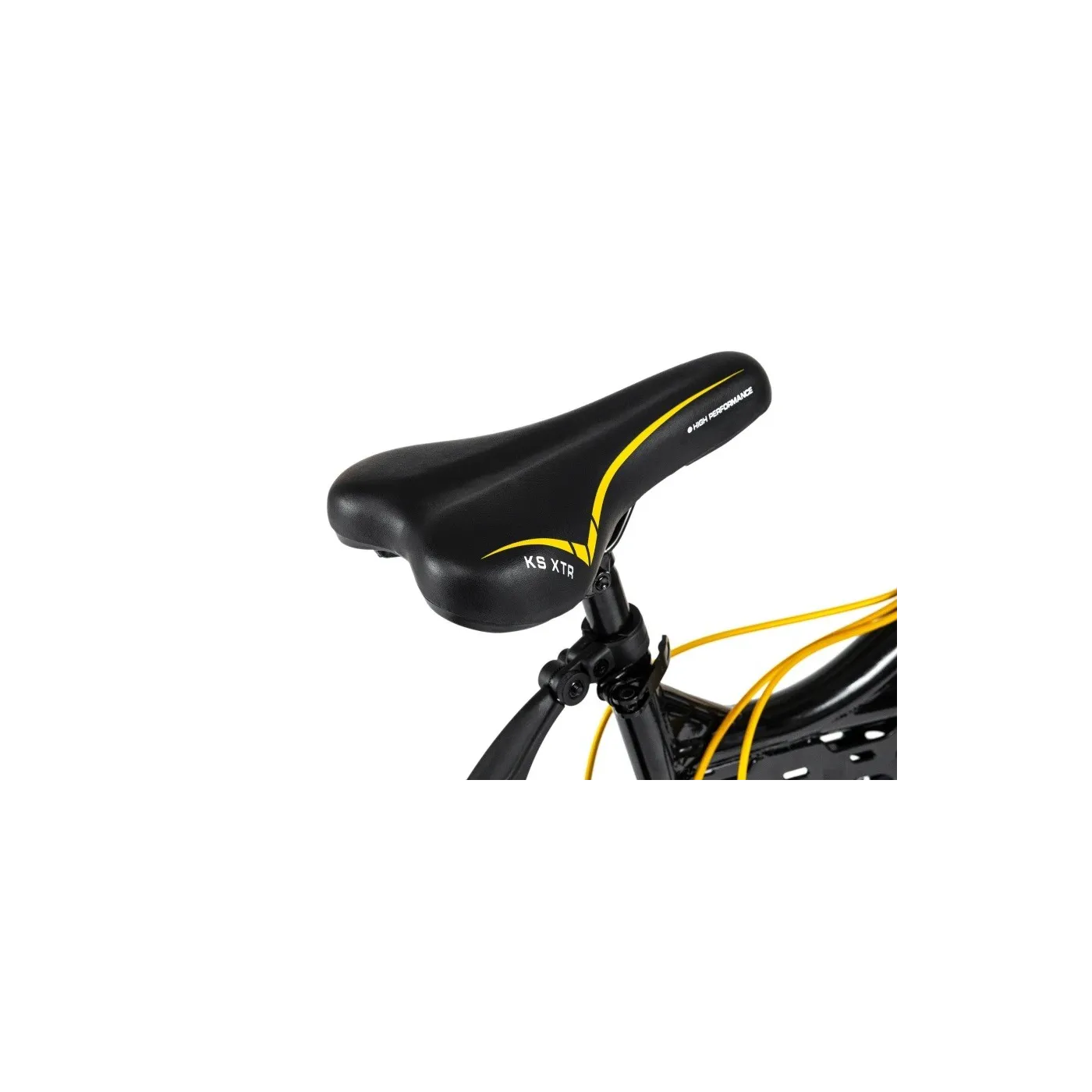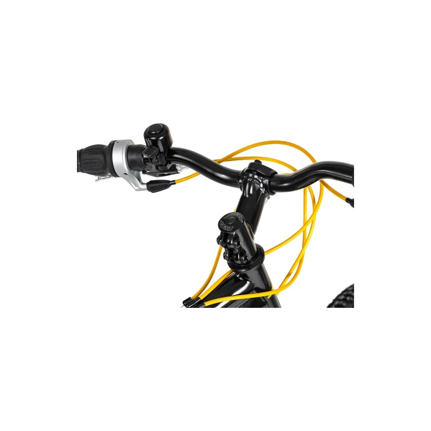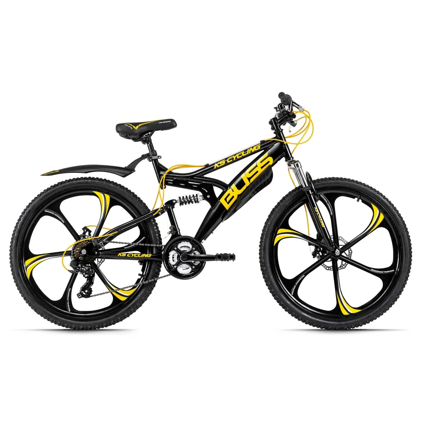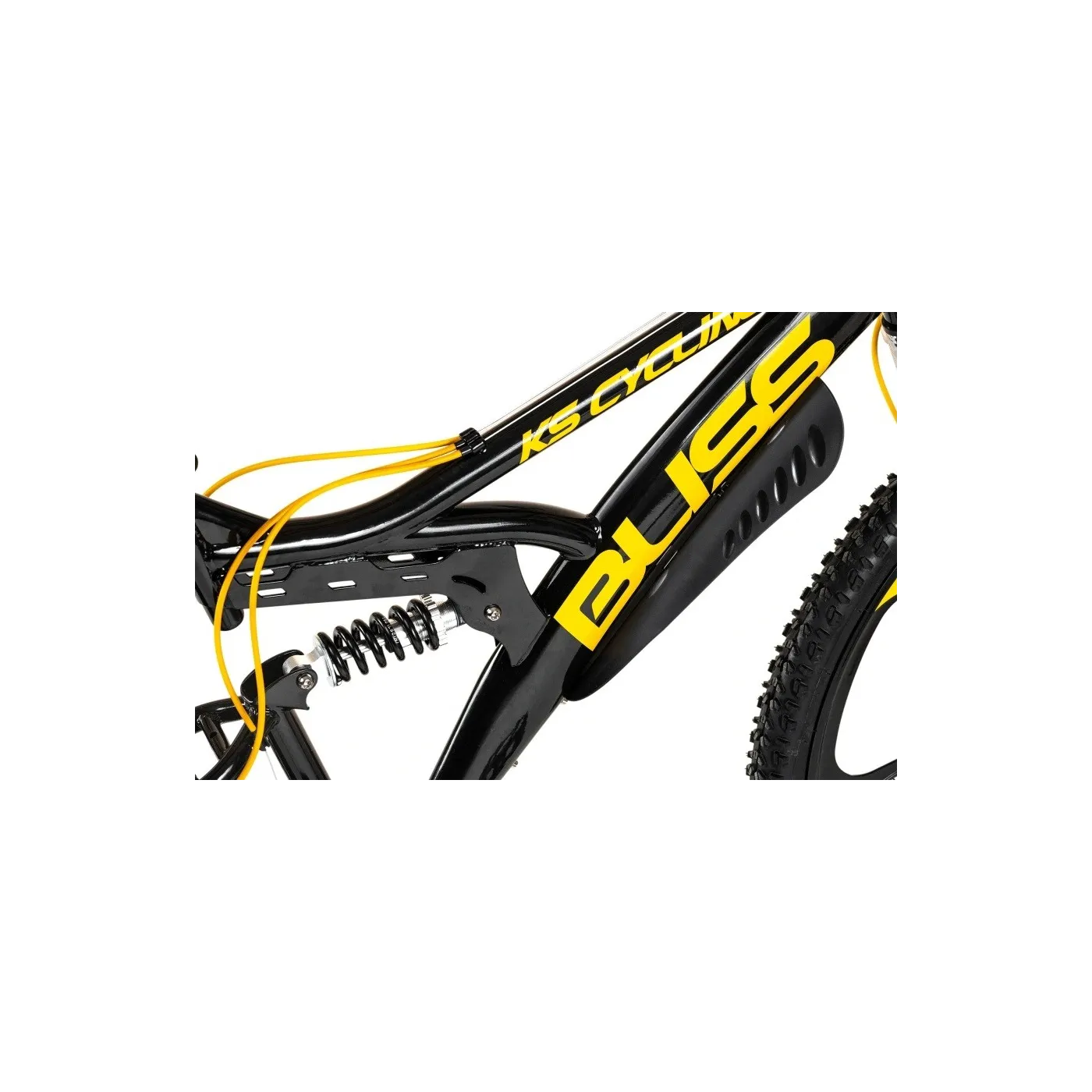 Zanurz się w przygodzie z kolarstwem górskim dzięki BLISS od KS Cycling! Ten 26" rower górski z pełnym zawieszeniem jest całkowicie czarny, z jaskrawymi żółtymi naklejkami, chwytami i kablami. Błotniki, podobnie jak siodełko, pasują do projektu. Niepowtarzalny wygląd, z którym wszyscy się zgadzają!