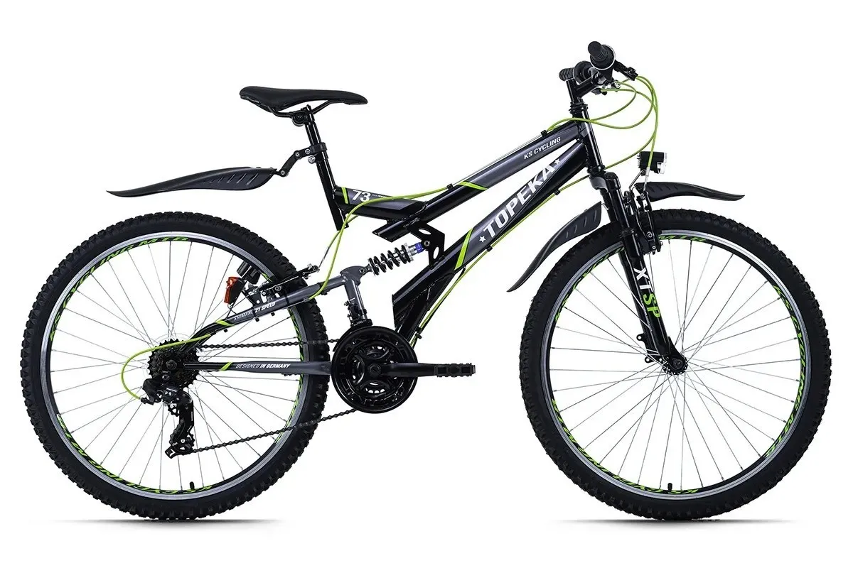 26-calowy w pełni MTB TOPEKA od KS Cycling ma czerwone detale na czarnej ramie. Rower absolutnie przyciąga wzrok!