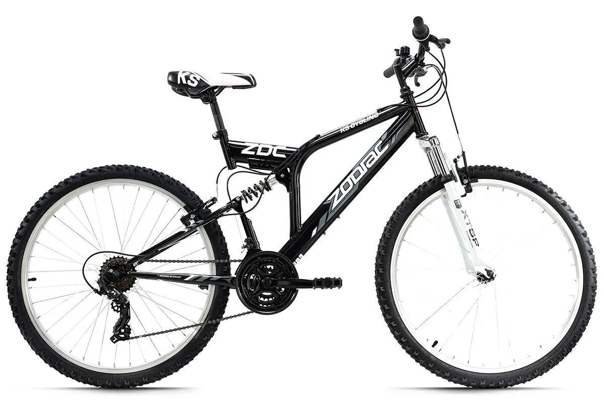 Świetny rower za niewielką cenę. Wypróbuj rower górski Zodiac 26″ marki KS Cycling z pełną amortyzacją. To idealny rower dla początkujących! Białe i szare akcenty na czarnej ramie o ciekawym kształcie przyciągają wzrok. Biało-czarne siodełko nie tylko dobrze wygląda, ale jest też wygodne dzięki odpowiedniemu anatomicznemu kształtowi.