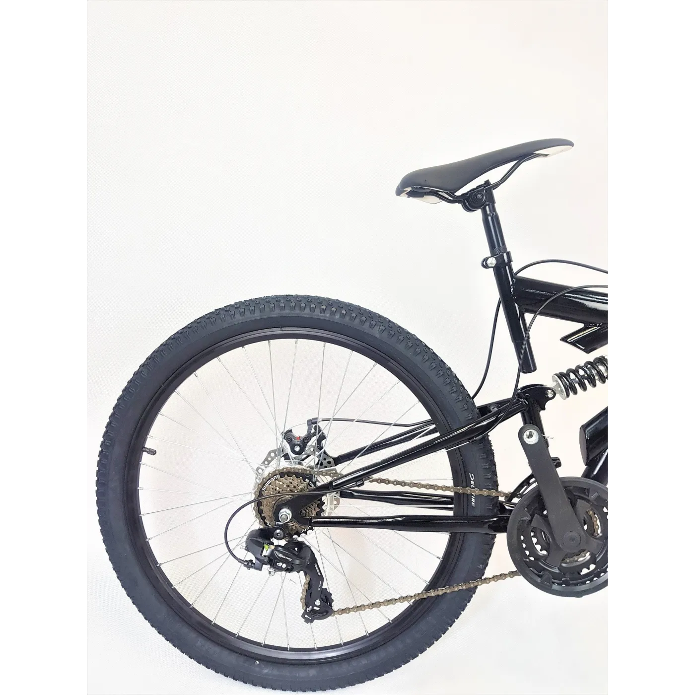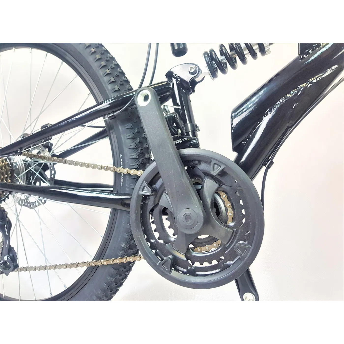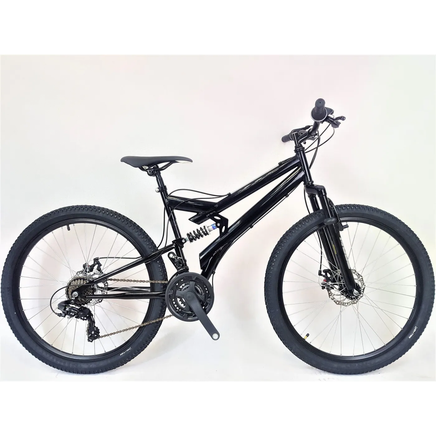 Rower MTB z pełnym zawieszeniem jest wyposażony w 21-biegową przerzutkę obsługiwaną za pomocą obrotowej dźwigni zmiany biegów. Mechaniczne hamulce tarczowe na przednich i tylnych kołach zapewniają dobre hamowanie.