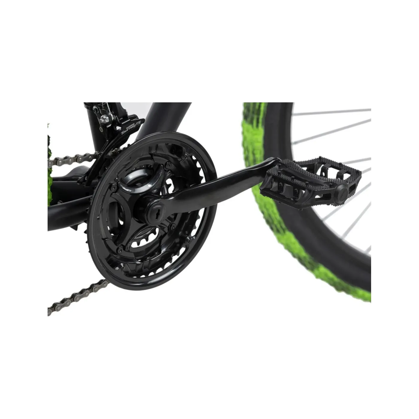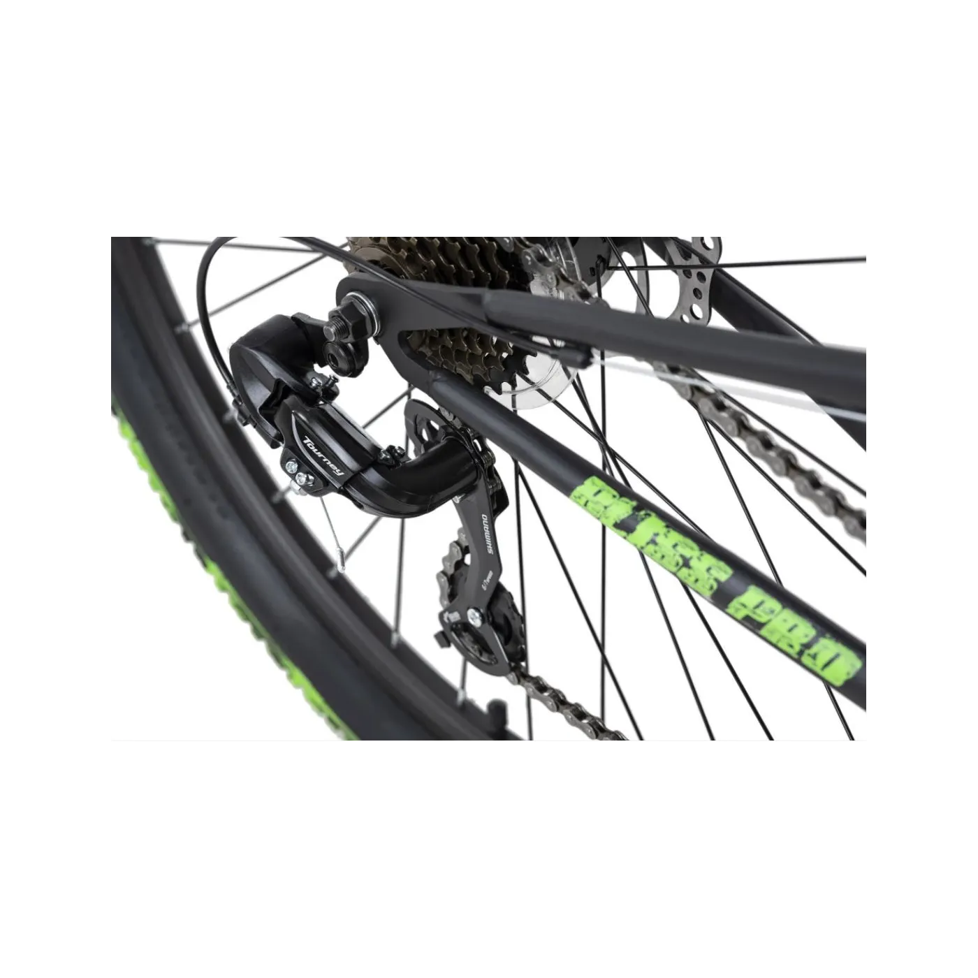 Ten rower górski z kołami 27,5″ nie tylko zachwyca ciekawym wyglądem, ale także dobrym wyposażeniem. Przerzutka SHIMANO Tourney ma 21 biegów, które można wygodnie zmieniać za pomocą manetek Shimano, które są proste w obsłudze i intuicyjne.