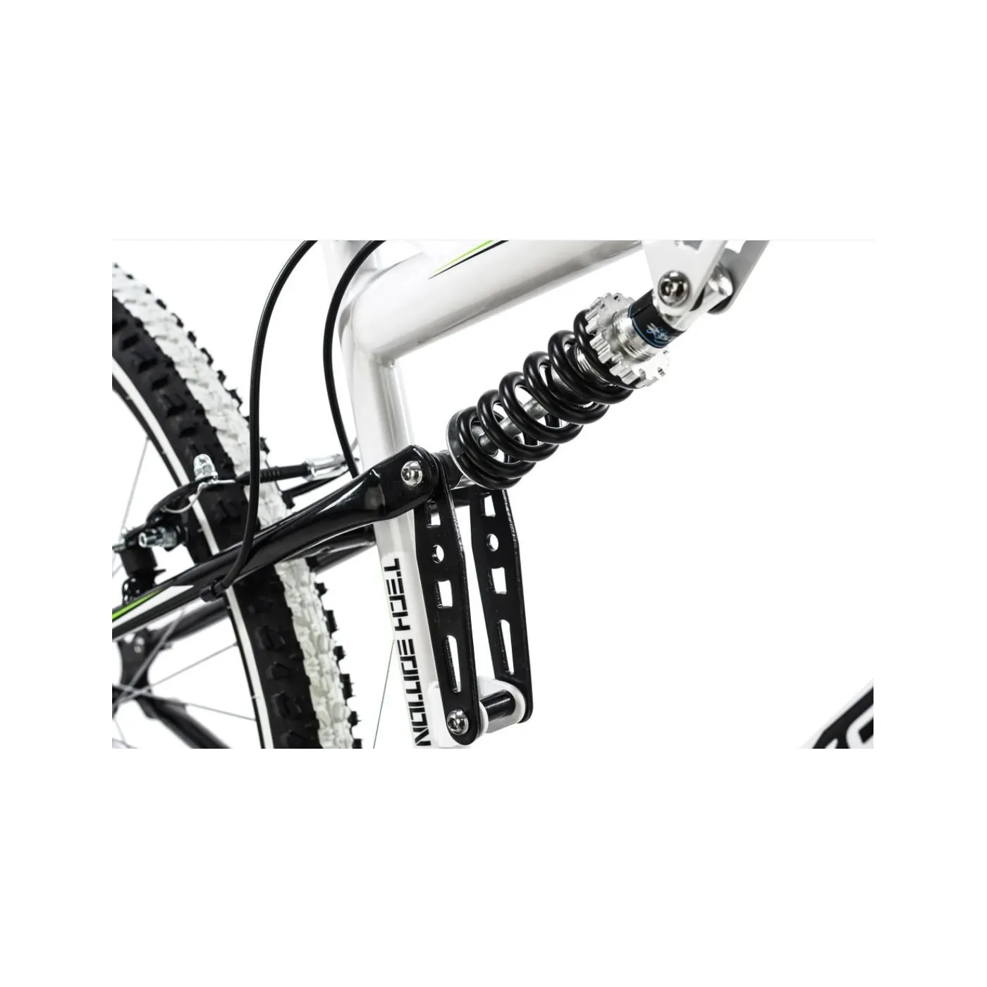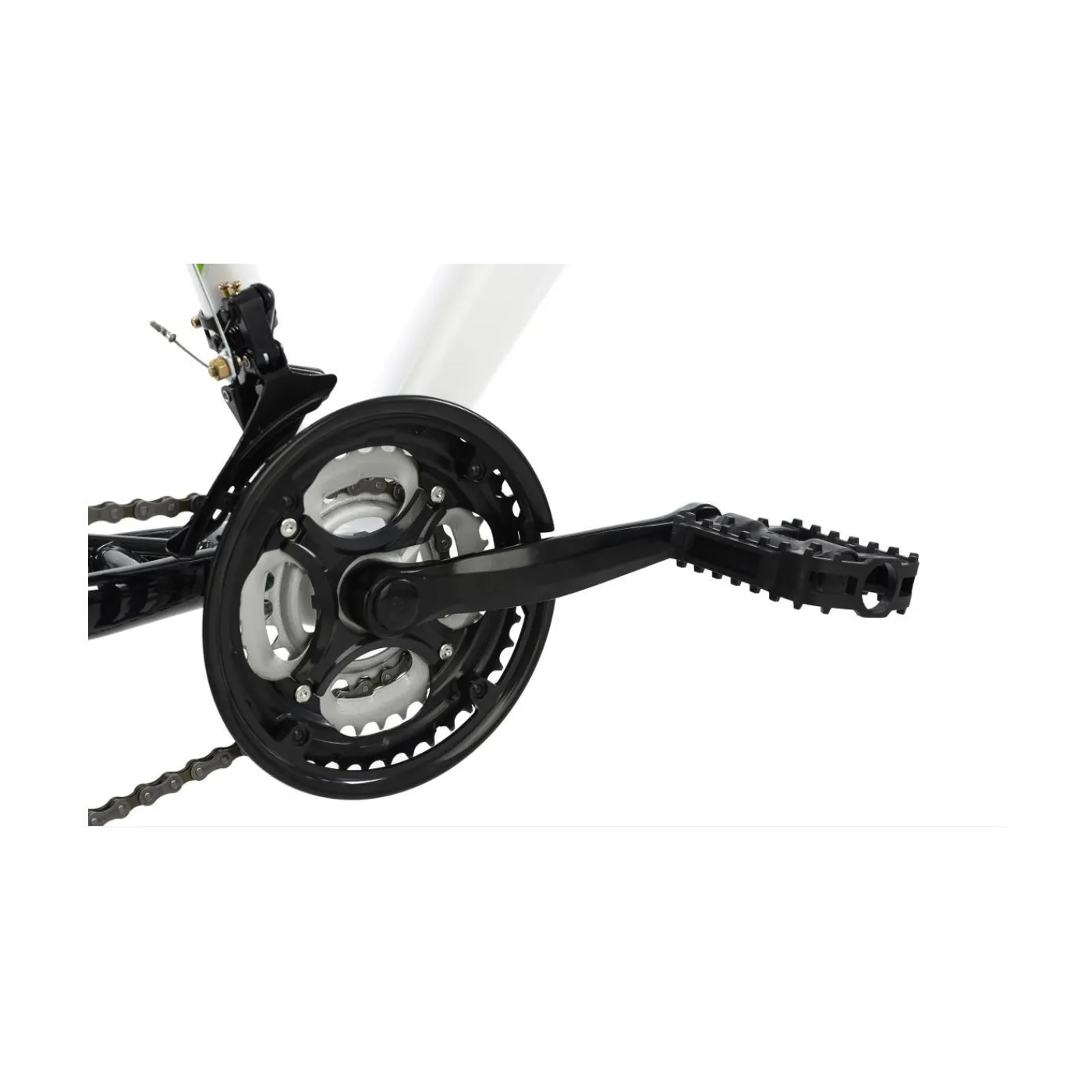Jego duże koła lepiej toczą się po przeszkodach, mają lepszą przyczepność dzięki większej powierzchni styku i mogą dużo szybciej rozwinąć prędkość. Wyposażony w 21-biegową zmianę biegów obsługiwaną za pomocą obrotowej dźwigni zmiany biegów oraz hamulce typu V-brake, które pozwolą na bezpieczne i skuteczne zatrzymywanie się oraz zwalnianie. Rama z pełnym zawieszeniem to komfort jazdy na każdej trasie!