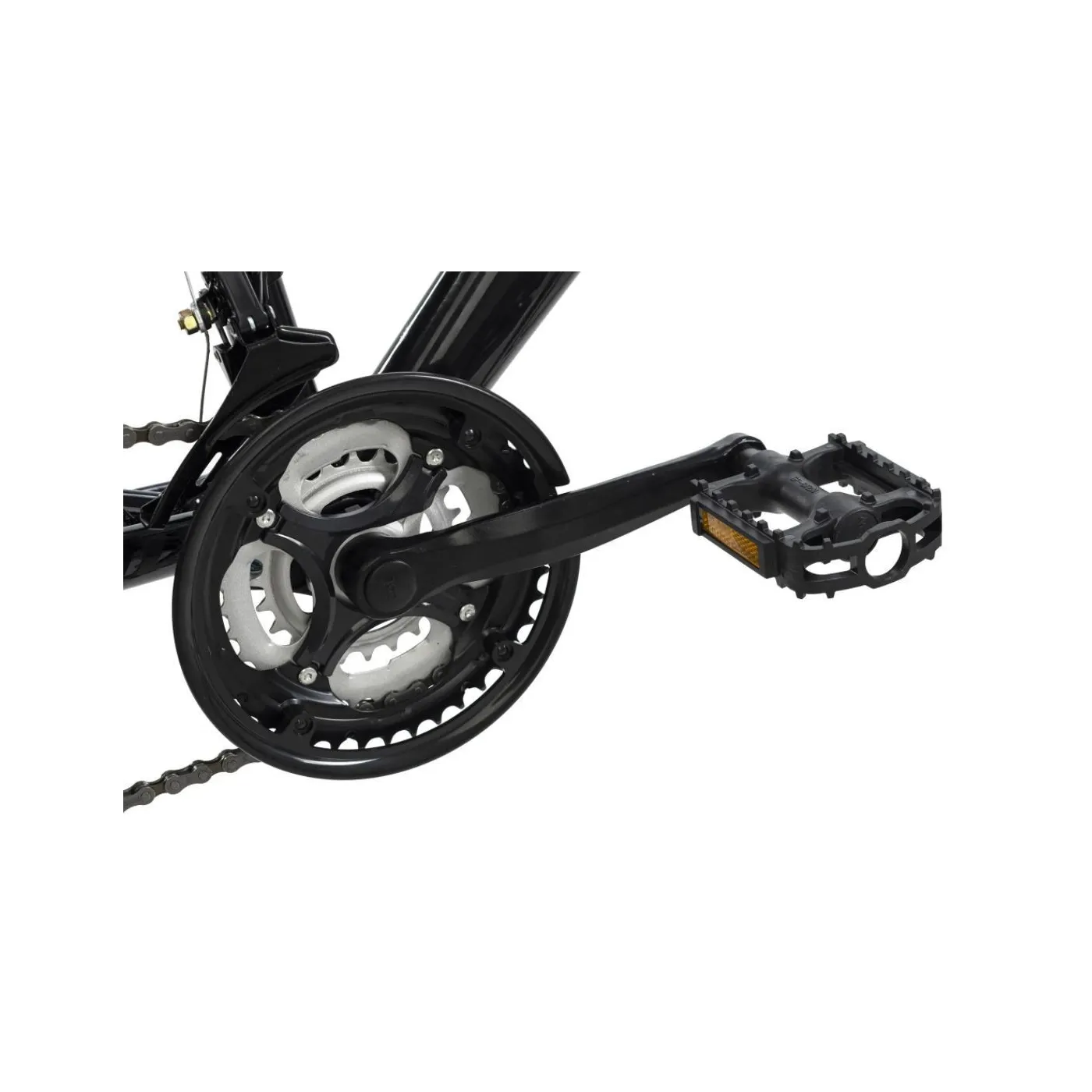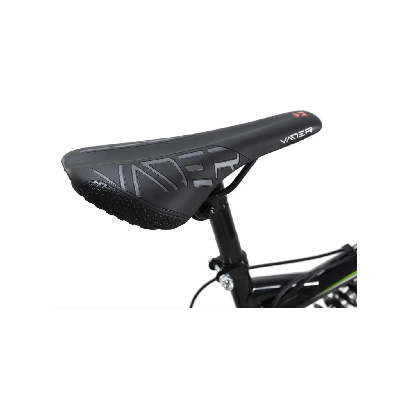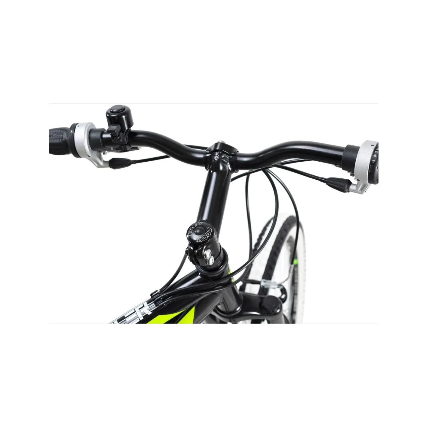 Białe i zielone akcenty na czarnej ramie o ciekawym kształcie oraz opony z białym paskiem przyciągają wzrok. Amortyzowany widelec i tylna regulowana sprężyna świetnie sobie radzą z nierównościami terenu, natomiast 21-biegowy system przerzutek SHIMANO doskonale sprawdzi się podczas wyzwań w terenie. Hamulce typu V-Brake zapewniają bezpieczne hamowanie w każdej sytuacji, a lekko profilowana kierownica sprawia, że masz dobrą kontrolę nad rowerem podczas jazdy.