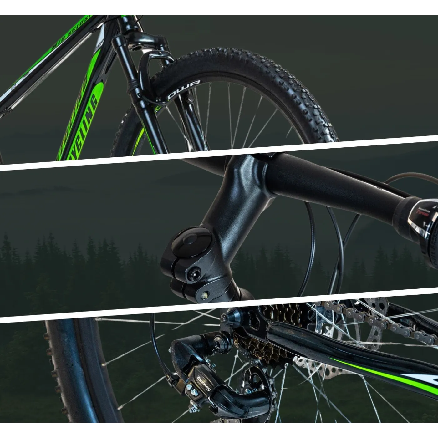 🎨 Estetykę roweru podkreśla czarne, błyszczące wykończenie z zielonymi wstawkami, nadające mu dynamiczny, sportowy wygląd. Kolorystyka jest nowoczesna, ale nieprzesadzona – przyciąga wzrok, jednocześnie zachowując klasę. W zestawie znalazł się także dzwonek, który dopełnia funkcjonalność roweru i zwiększa bezpieczeństwo podczas jazdy wśród pieszych czy innych rowerzystów.