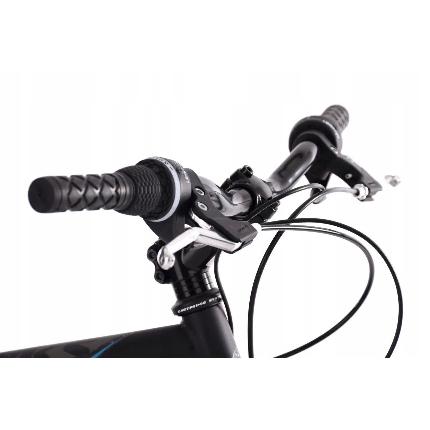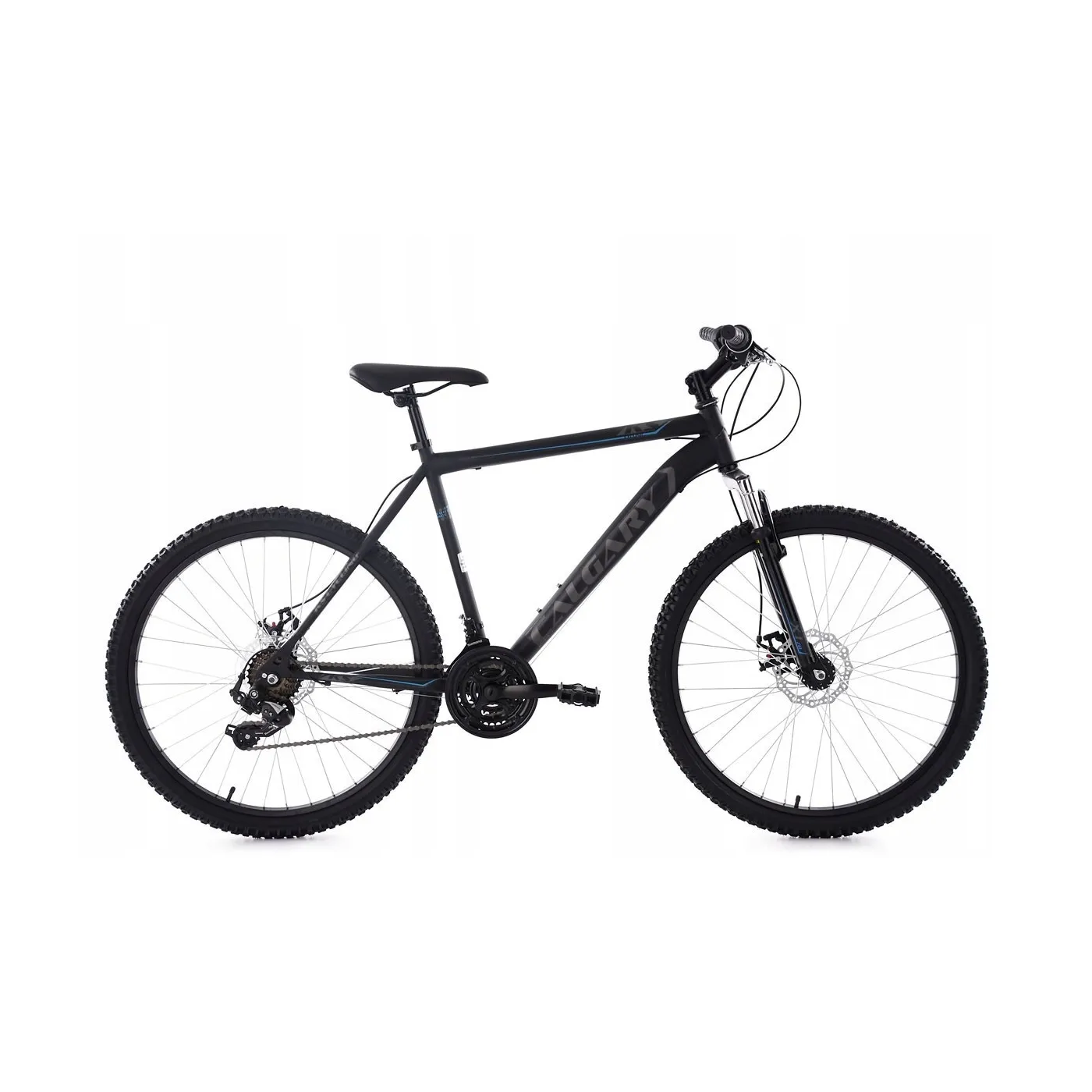 Zawsze gotowy do jazdy na pełnych obrotach - czarny rower górski CALGARY firmy KS Cycling, który doskonale komponuje się z elementami w kolorze szarym i niebieskim. Wyposażenie jest równie przekonujące. Rower posiada 21-biegową przerzutkę z obrotową manetką Shimano, która daje wygodną regulację jazdy. Mechaniczne hamulce tarczowe z przodu i z tyłu zapewniają niezbędne hamowanie.
