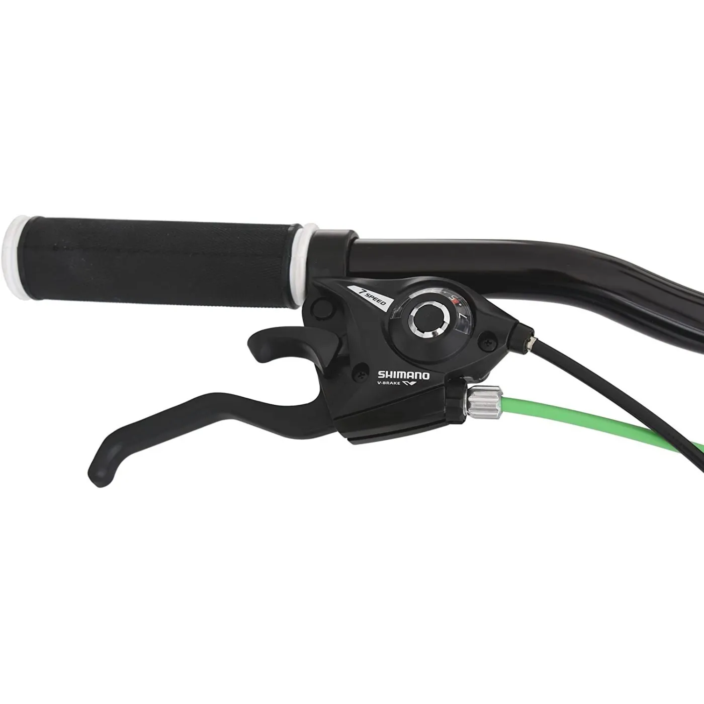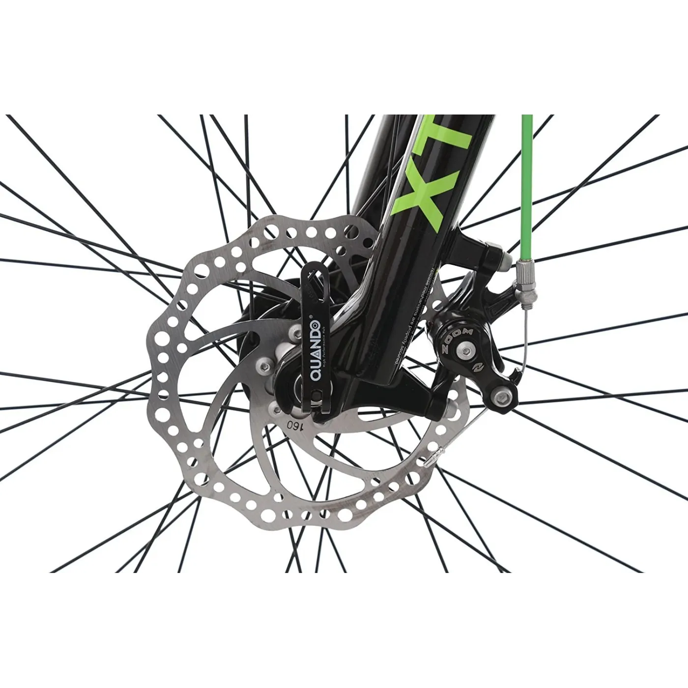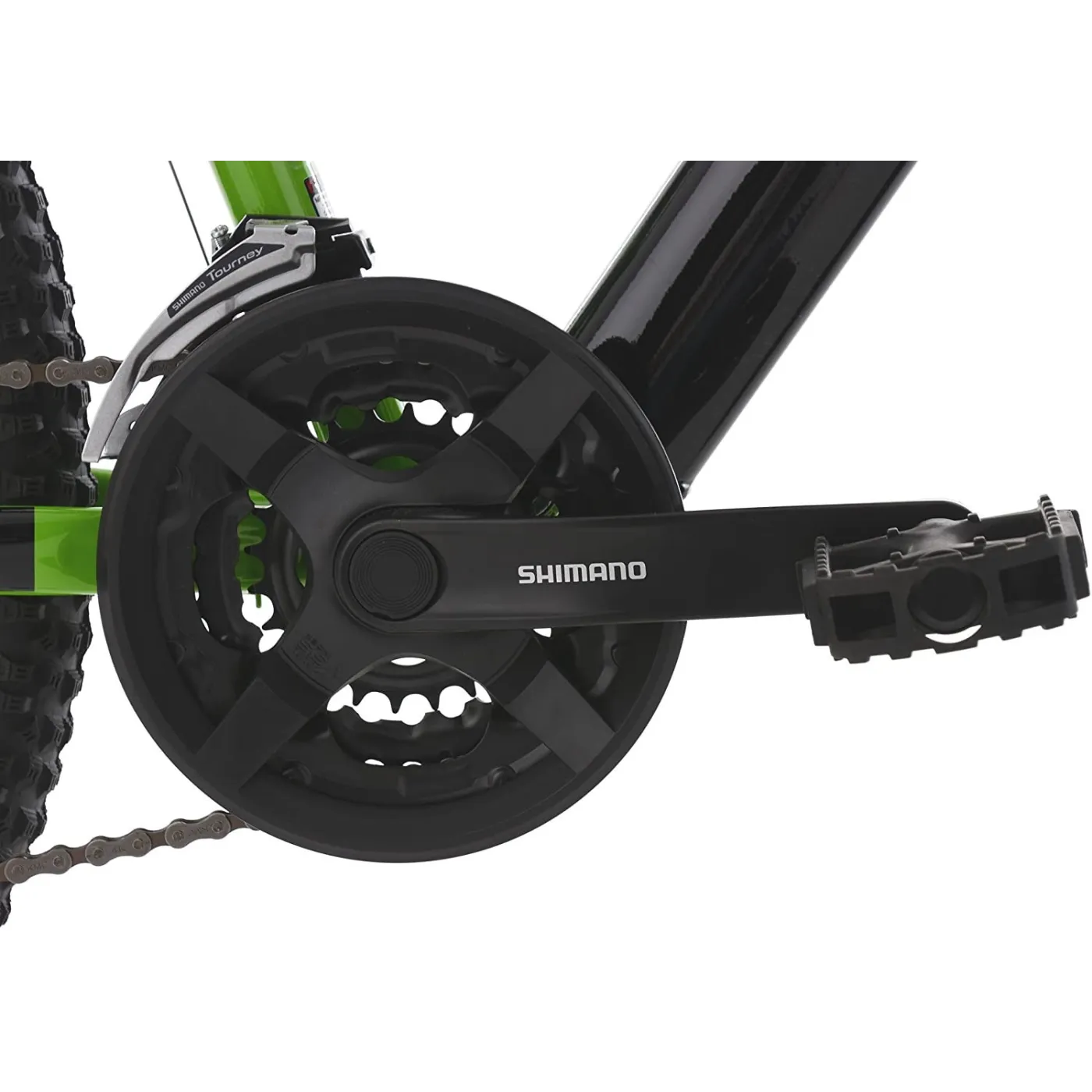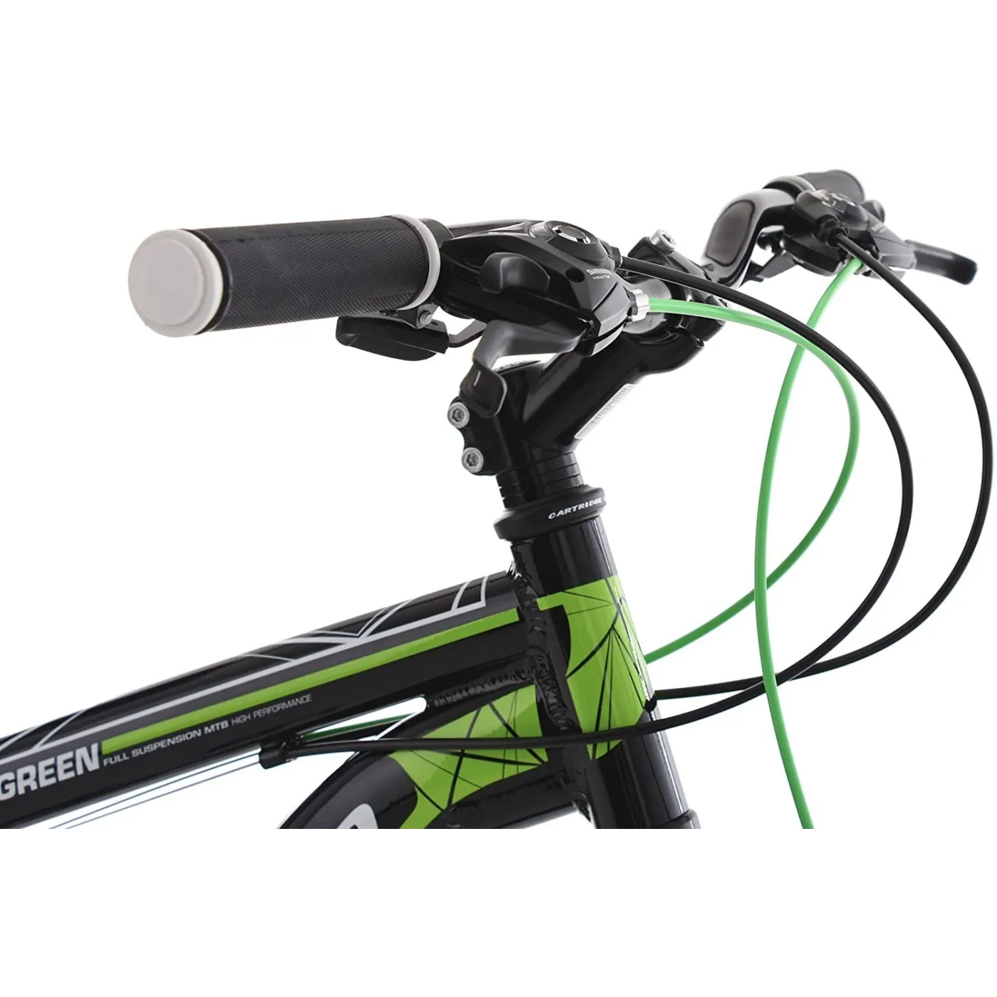 Czarna aluminiowa rama i bardzo szczegółowe zielone naklejki, umieszczone pod lakierem dla idealnego dopasowania, dają ładny ogólny obraz. Widelec amortyzowany SR SUNTOUR zapewnia komfortową jazdę w połączeniu z zawieszeniem ramy, nawet poza utartym torem. Podwójne hamulce tarczowe zapewniają solidne hamowanie. Z dwuściennymi obręczami aluminiowymi, 21 przełożeniami i mostkiem Ahead, to MTB tworzą świetną całość.