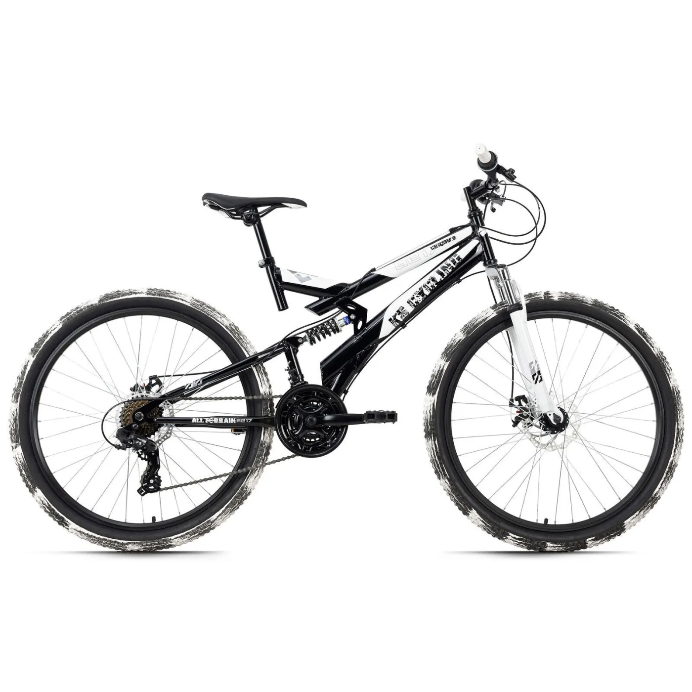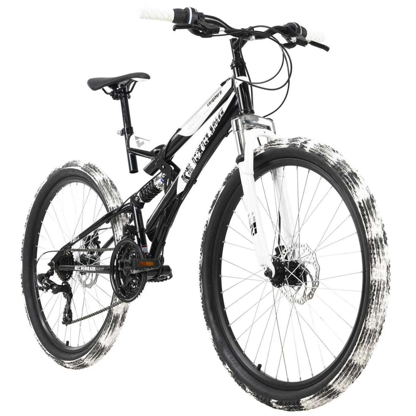 Rower MTB z pełnym zawieszeniem jest wyposażony w 21-biegową przerzutkę obsługiwaną za pomocą obrotowej dźwigni zmiany biegów. Mechaniczne hamulce tarczowe na przednich i tylnych kołach zapewniają dobre hamowanie. Opony Muddy White są również imponujące: malowanie zostało naniesione ręcznie na każdy egzemplarz - nie ma drugiej takiej samej opony - każda jest absolutnie wyjątkowa!