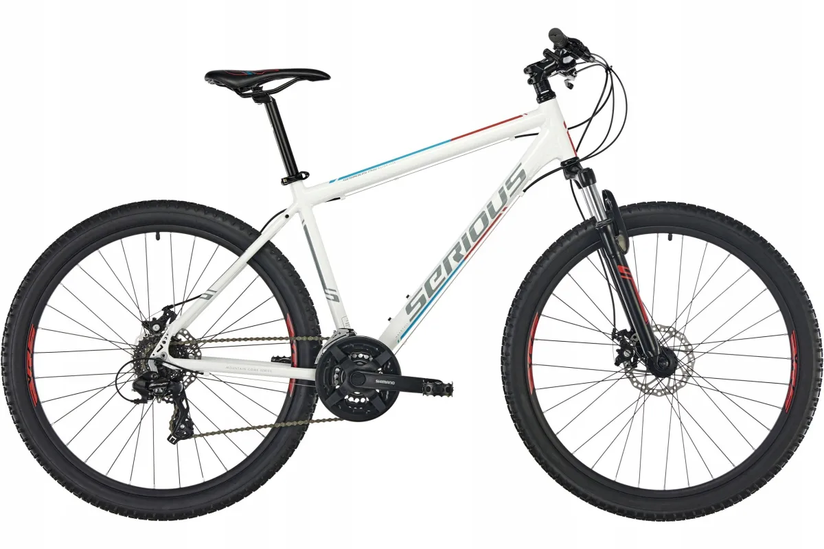 To właśnie oferta stworzona specjalnie dla Ciebie. Aluminiowy i lekki rower górski marki SERIOUS w idealnej kolorystyce białego połysku z czerwonymi i niebieskimi detalami. Posiada mocne mechaniczne hamulce tarczowe, które dodają większej kontroli.