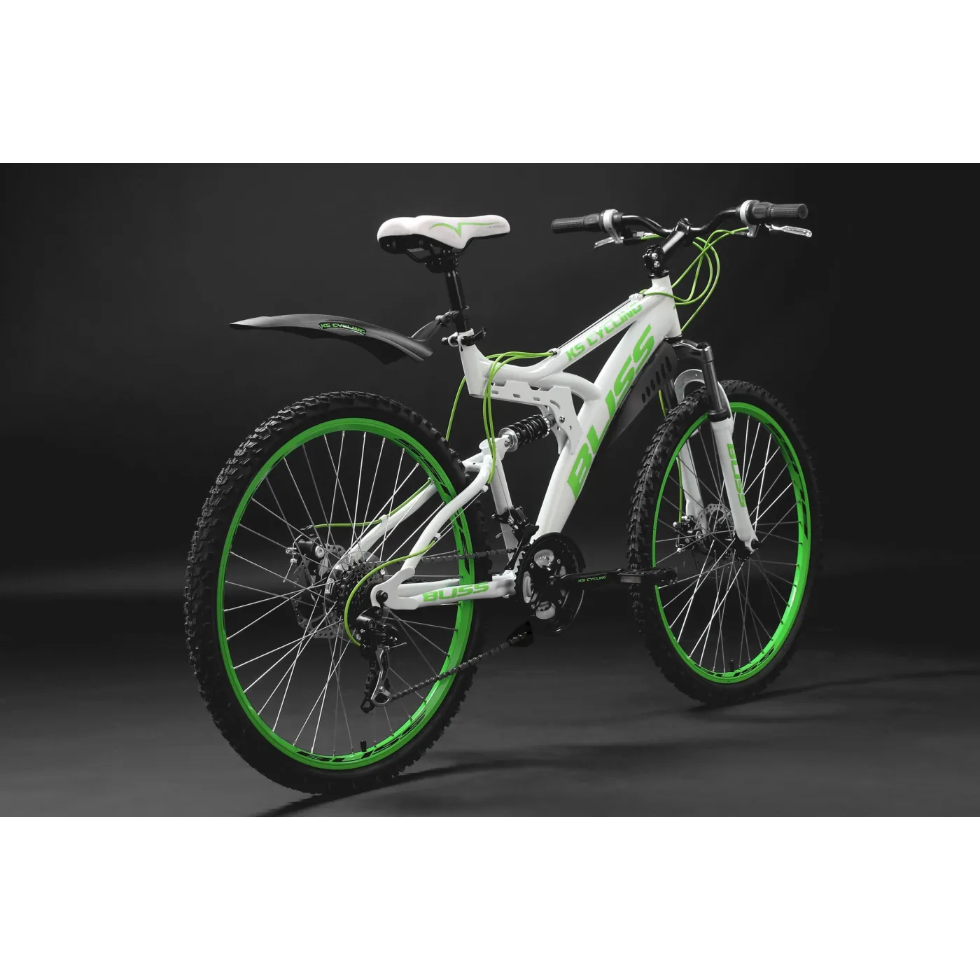 26-calowy rower górski z pełnym zawieszeniem w kolorze białym z jasnozielonymi detalami, które sprawiają, że rower wyróżnia się spośród innych.