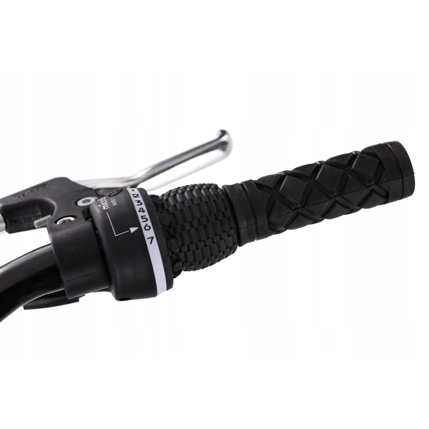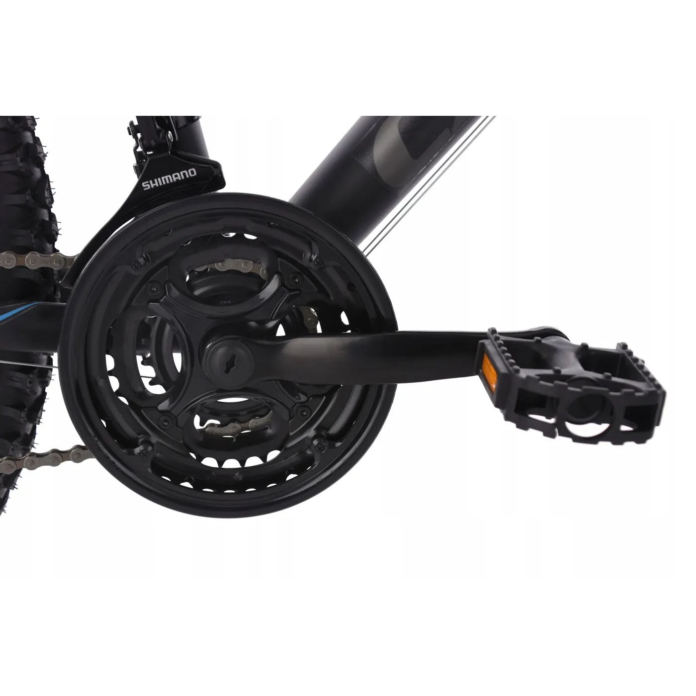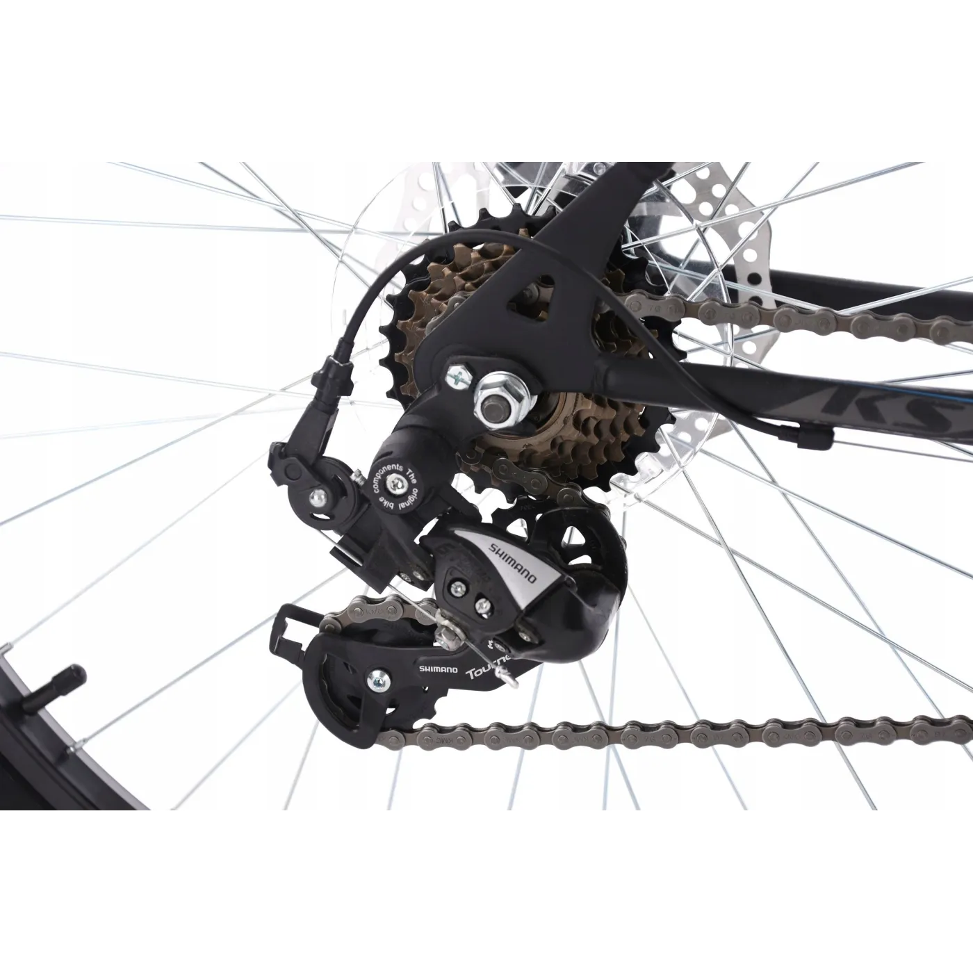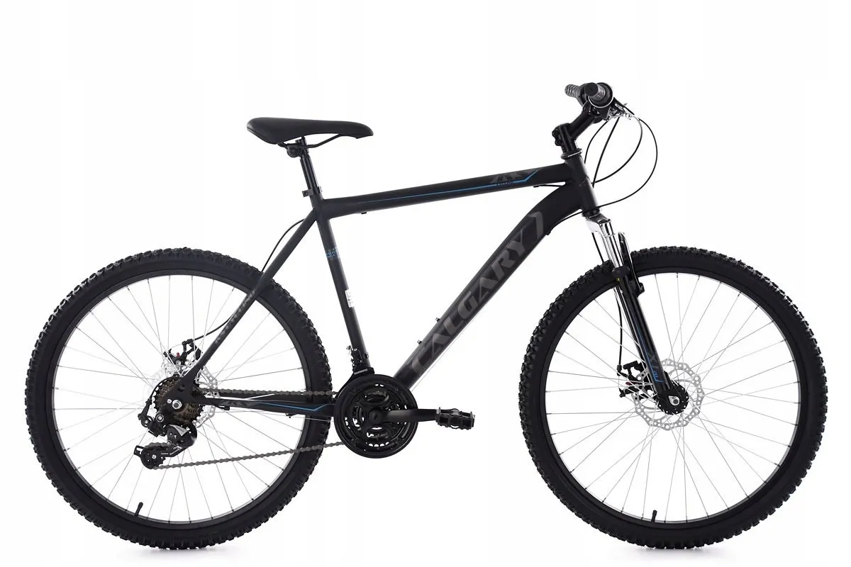 Zawsze gotowy do jazdy na pełnych obrotach - czarny rower górski CALGARY firmy KS Cycling, który doskonale komponuje się z elementami w kolorze szarym i niebieskim. Wyposażenie jest równie przekonujące. Rower posiada 21-biegową przerzutkę z obrotową manetką Shimano, która daje wygodną regulację jazdy. Mechaniczne hamulce tarczowe z przodu i z tyłu zapewniają niezbędne hamowanie.