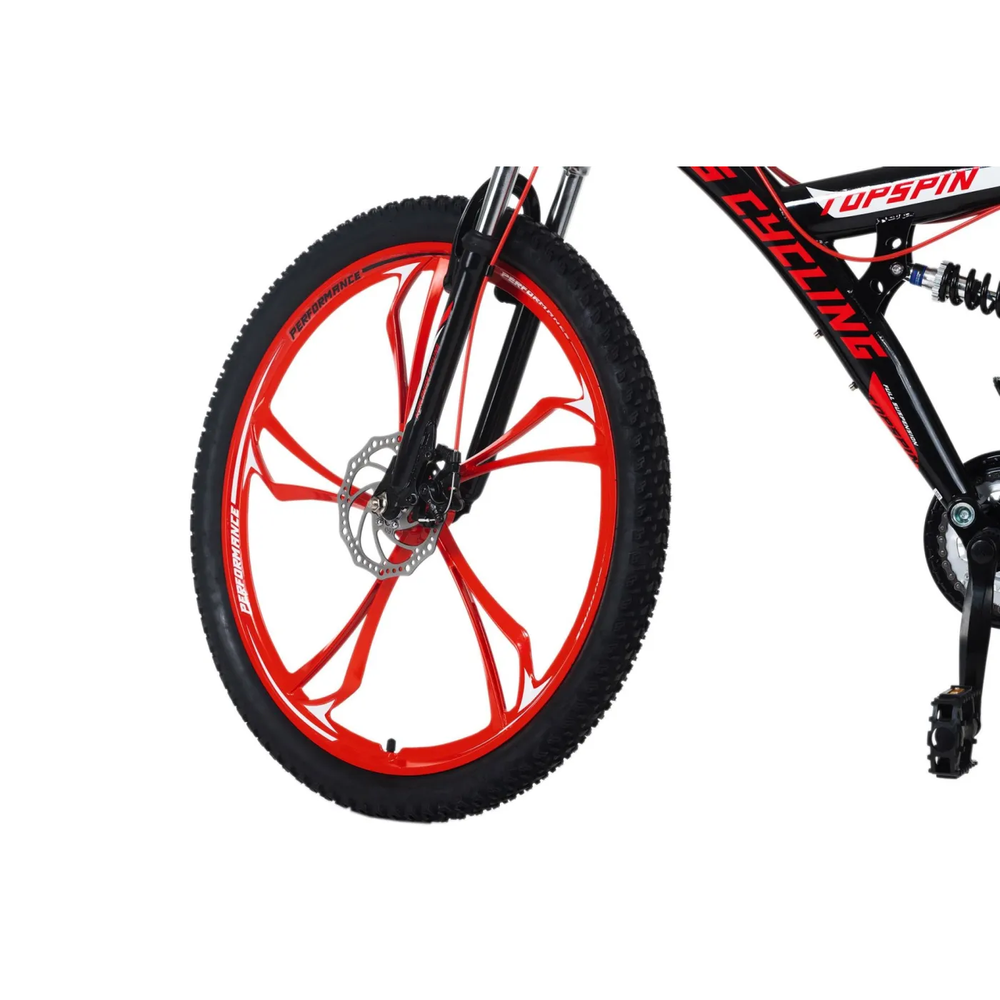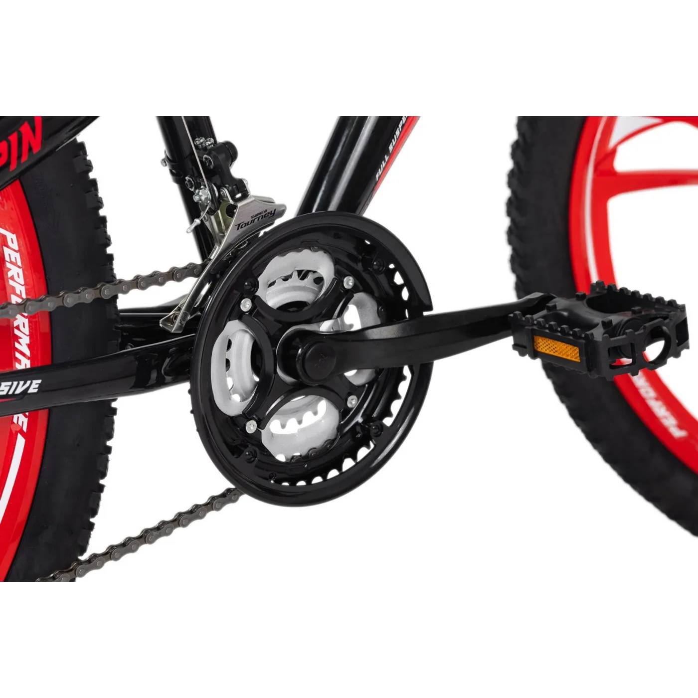 ✨ Zanurz się w przygodę kolarstwa górskiego: z TOPSPIN od KS Cycling! Rower górski 26" z pełnym zawieszeniem jest dostępny w kolorze czarnym z kolorowymi naklejkami i uchwytami na linki. Siodełko jest również w pełni dopasowane do projektu. Ten niesamowity wygląd będzie zawsze w centrum uwagi!