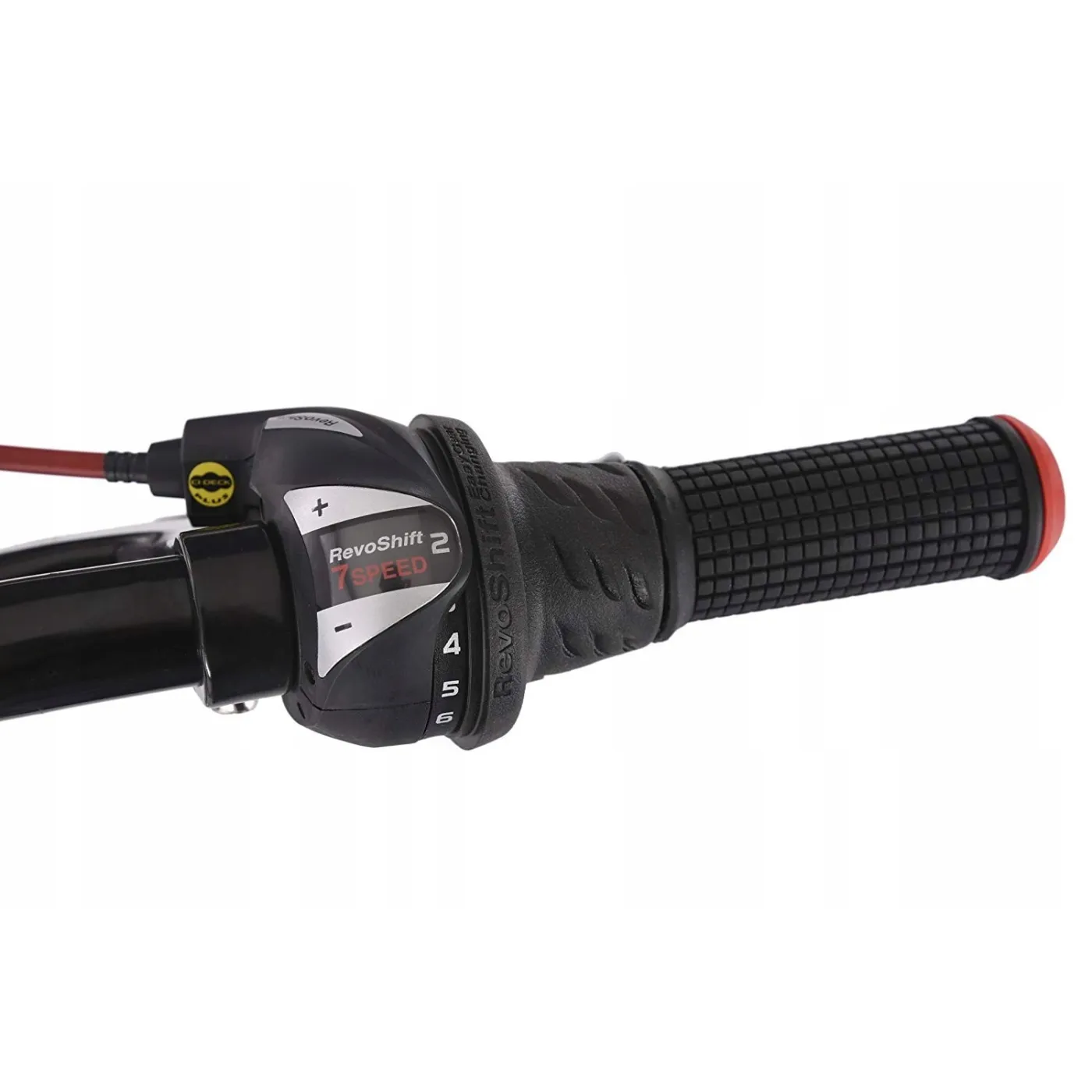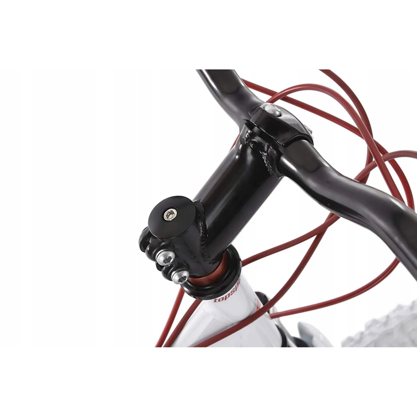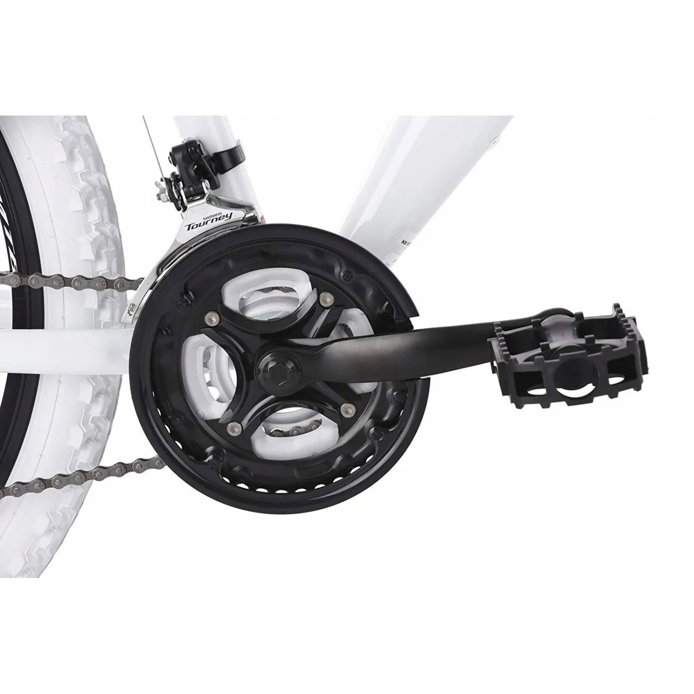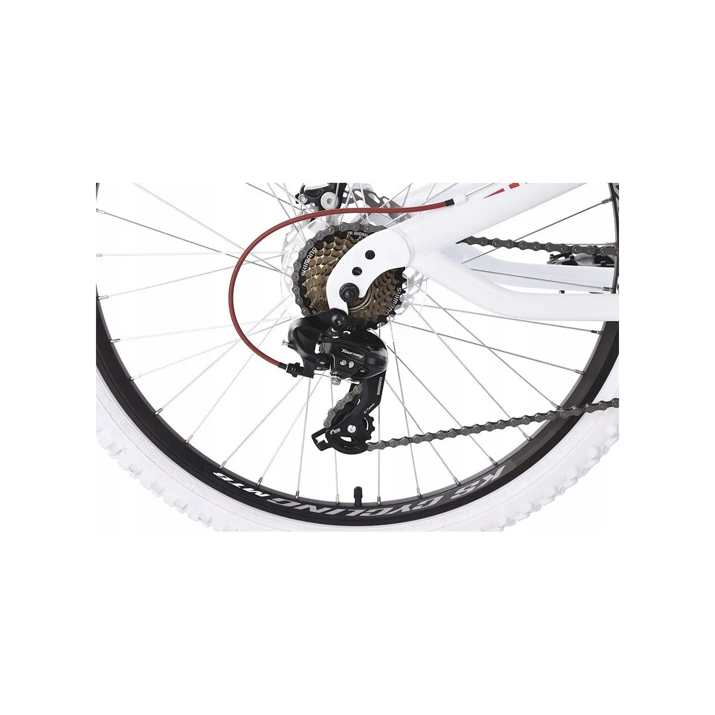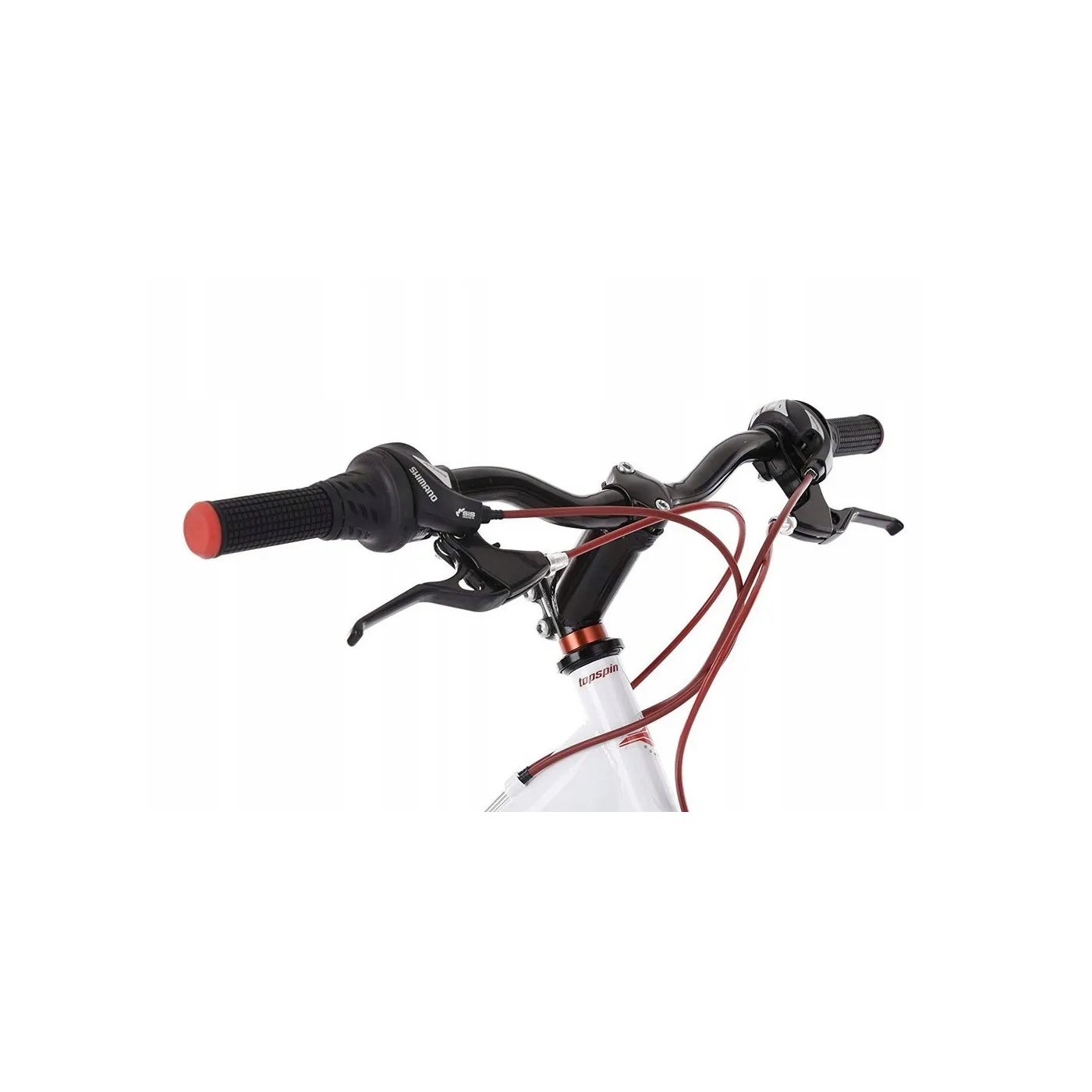 Rower wyposażony jest w wysokiej jakości osprzęt: solidne hamulce tarczowe, które gwarantują bezpieczeństwo i krótką drogę hamowania, a wygodne manetki SHIMANO Revoshift do zmiany biegów, będą pomocne przy pokonywaniu kolejnych wymagających wzniesień. Biały kolor i standardowy design stanie się ulubieńcem każdego kto ceni prostotę i klasyk.