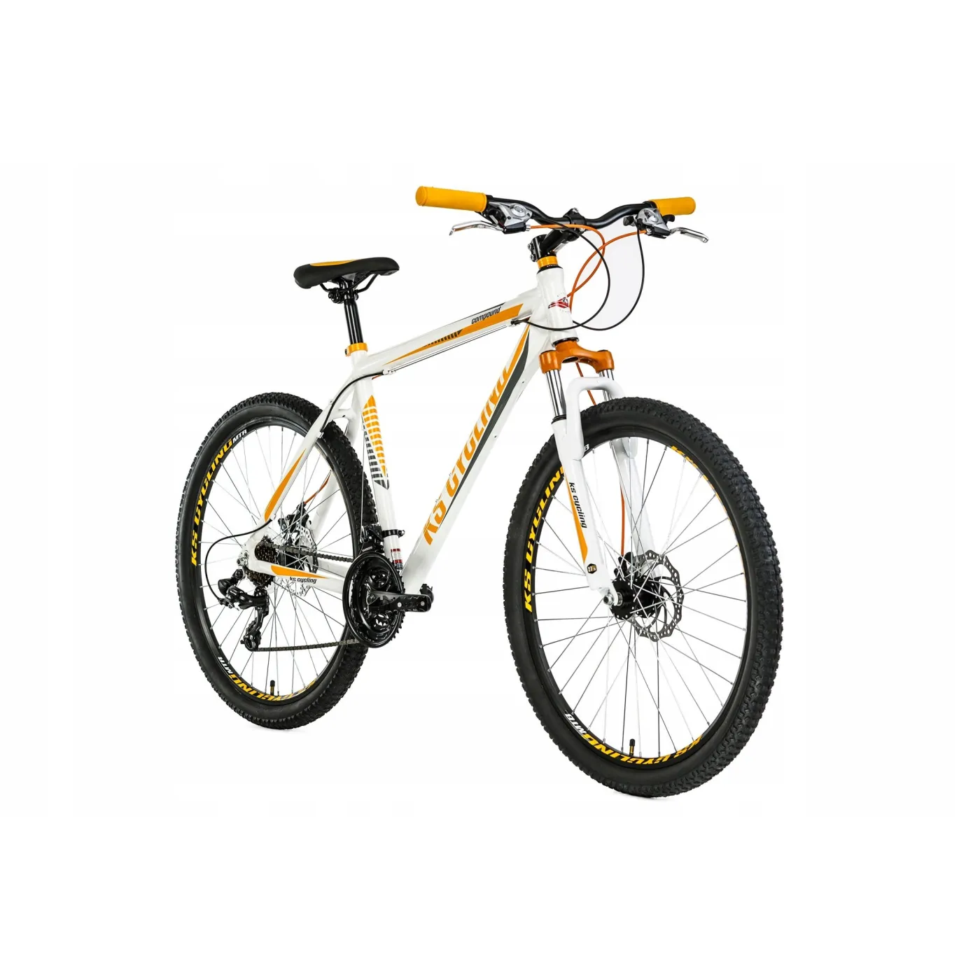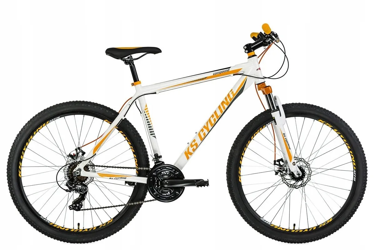 OpisRower górski COMPOUND firmy KS Cycling zachwyca swoją specyfikacją techniczną i świetnym wyglądem. Kontrastowe naklejki na białej ramie szczególnie przyciągają wzrok. Rower jest dopracowany w każdym calu, od komfortowego siodełka aż po duże 27,5 calowe koła. Wyposażony w hamulce tarczowe oraz 21-biegową przerzutkę, zapewnia niezbędne przyspieszenie i bezpieczne hamowanie. Dodatkowo rama, korba, sztyca oraz mostek są wykonane z aluminium, dzięki czemu rower jest wyjątkowo lekki.