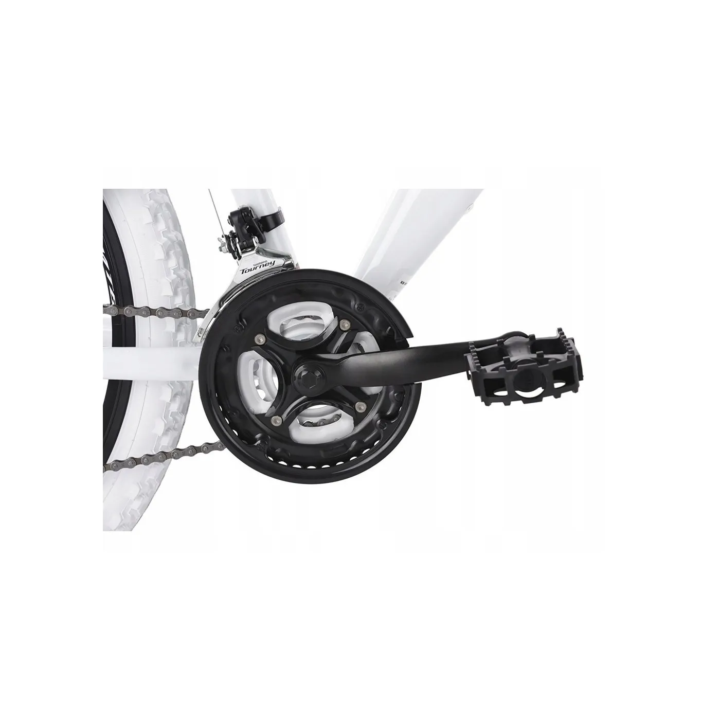 Rower wyposażony jest w wysokiej jakości osprzęt: solidne hamulce tarczowe, które gwarantują bezpieczeństwo i krótką drogę hamowania, a wygodne manetki SHIMANO Revoshift do zmiany biegów, będą pomocne przy pokonywaniu kolejnych wzniesień. Jasny, biały kolor i standardowy design na pewno spodoba się użytkownikom lubiącym klasykę.