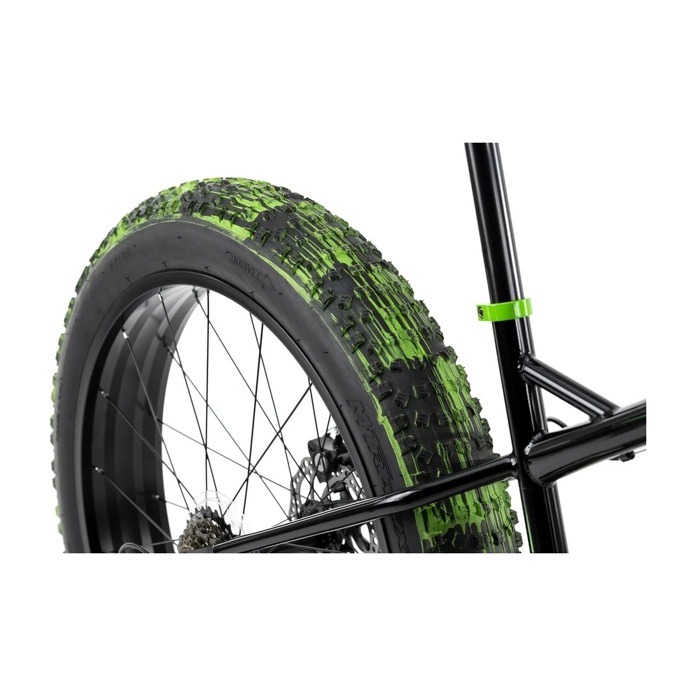 FATBIKE jest stworzony do ekstremalnych warunków i jeździ wszędzie! Trakcja na trudnych nawierzchniach, takich jak piasek, błoto czy śnieg jest niewiarygodna i nie stanowi już problemu dzięki grubym oponom, niemniej jednak opory toczenia w normalnym terenie są zaskakująco niskie. Widelec amortyzowany jest równie dobry jak zbędny, ponieważ obszerne opony zapewniają duży komfort amortyzacji. Malowanie zostało również naniesione ręcznie – każda zabłocona opona jest więc absolutnie wyjątkowa. Nie ma dwóch takich samych.