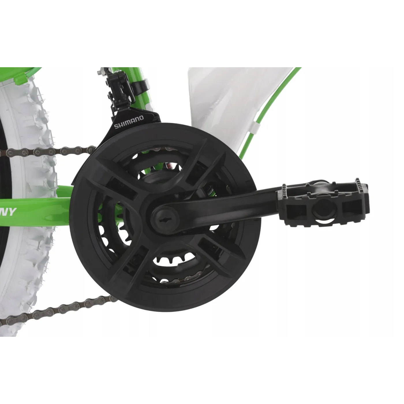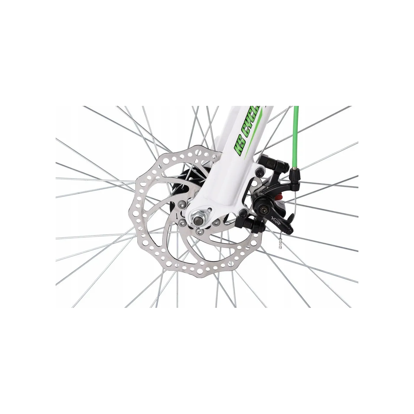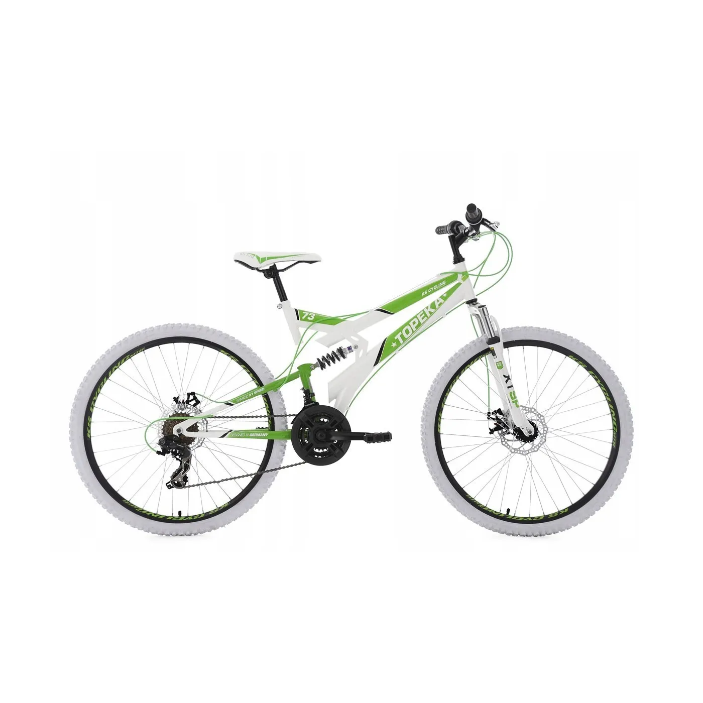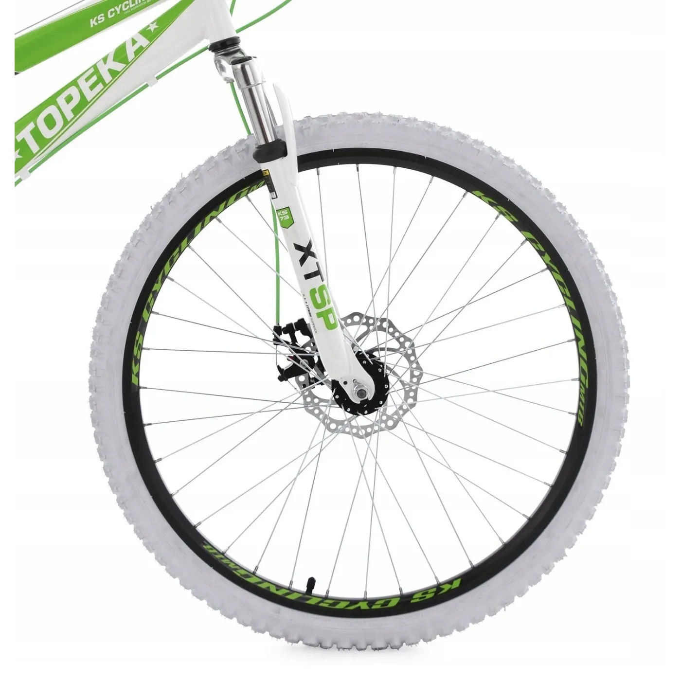Białe opony roweru TOPEKA to z pewnością jeden z najbardziej przyciągających wzrok elementów. W połączeniu z zielonymi dodatkami sprawiają, że cały rower wygląda wyjątkowo i zwraca na siebie uwagę. Dodając do tego doskonałe wyposażenie takie jak amortyzacja ramy oraz widelca, a także 21-biegowe przerzutki Shimano, otrzymujemy fantastyczny rower, który będzie inwestycją na lata.
