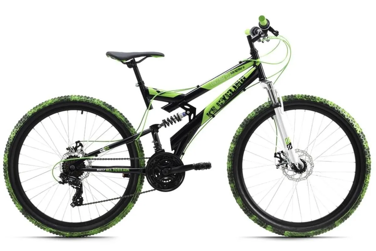26-calowy rower Fully-MTB CRUSHER firmy KS Cycling został zaprojektowany z jasnozielonymi detalami w fajnym wyglądzie „Destroyed”. Opony z kolcami w kolorze Muddy Green są również imponujące: malowanie zostało naniesione ręcznie na każdy egzemplarz osobno - dlatego każdy jest absolutnie wyjątkowy!