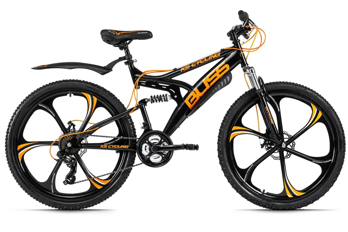 Wyrusz w przygodę na rowerze górskim z BLISS od KS Cycling! 26-calowy rower górski z pełnym zawieszeniem, w kolorze czarnym z naklejkami i kablami w kontrastującym kolorze pomarańczowym. Ten niesamowity wygląd sprawia, że rower jest wszędzie w centrum uwagi!