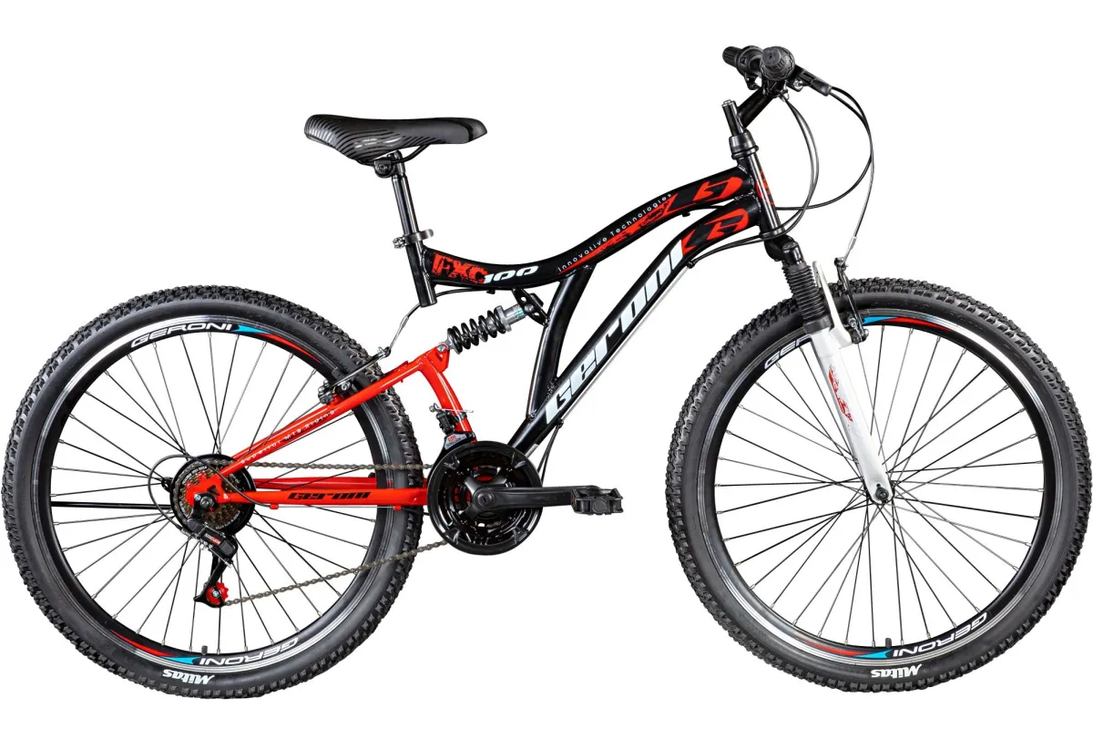 26-calowy rower górski Geroni FXC 100 jest idealny dla aktywnych młodych ludzi, którzy lubią spędzać cały dzień na świeżym powietrzu! Ten Fully MTB ma zarówno widelec amortyzowany, jak i amortyzator ramy.