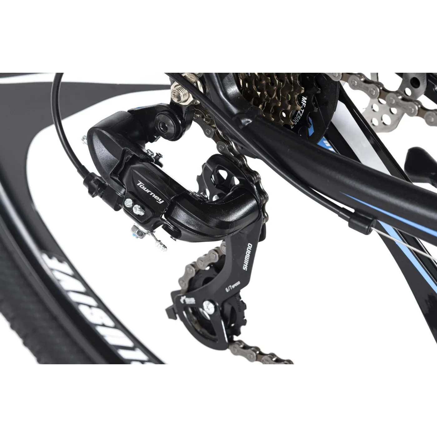 29-calowy rower górski XPlicit firmy KS Cycling ma czarną ramę z kolorowymi naklejkami i jest nowoczesny i modny! Rower górski jest wyposażony w 21-biegową przerzutkę i jest wyposażony w wiele komponentów marki SHIMANO. Hamowanie zawiera mechaniczne hamulce tarczowe. Absolutną atrakcją są jednak stabilne 29-calowe koła magnezowo-aluminiowe o niepowtarzalnym wyglądzie i wysokiej jakości uszczelnionych łożyskach kulkowych.