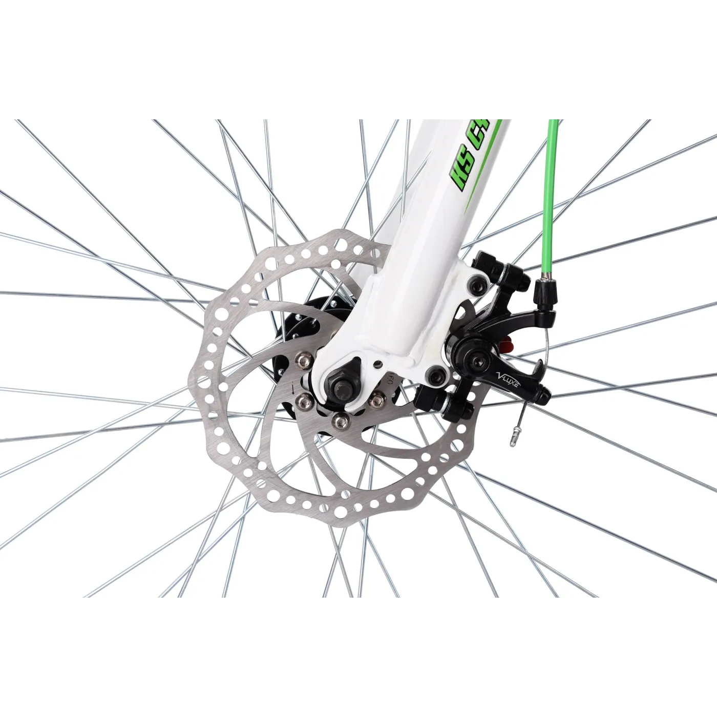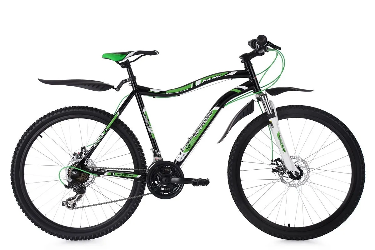Nietypowa, odważnie ukształtowana rama utrzymana w czarno-zielonej kolorystyce i w połączeniu z białym, amortyzowanym widelcem naprawdę przyciąga wzrok! Napęd roweru to kompozycja komponentów Shimano z grupy Tourney, 21 przełożeń to wystarczająca ilość do swobodnej jazdy w zróżnicowanym terenie. Rozpędzony rower zatrzymają mechaniczne hamulce tarczowe, które odznaczają się dużą siłą hamowania i odpornością na warunki atmosferyczne. To wygodny rower zarówno do sportowej jak i do rekreacyjnej jazdy.