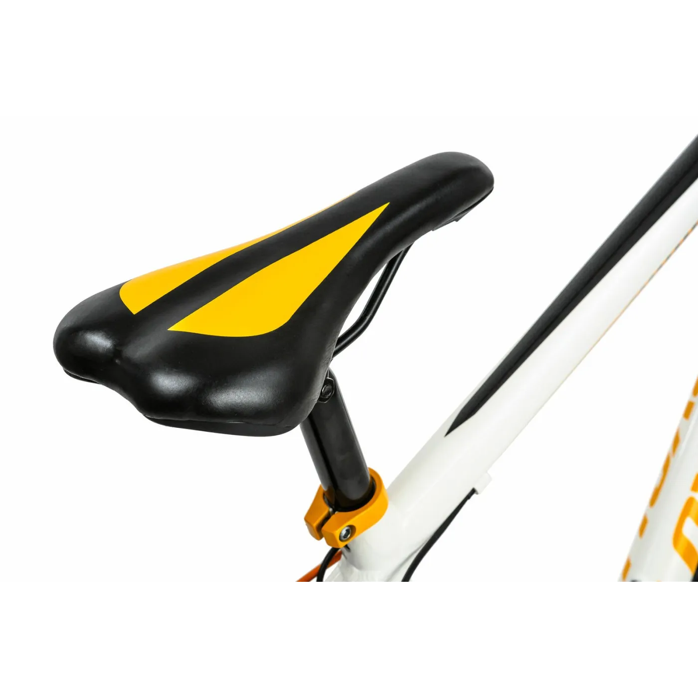 Kontrastowe naklejki na białej ramie szczególnie przyciągają wzrok. Rower dopracowany w każdym calu począwszy od hamulców tarczowych po doskonałej jakości przerzutki Shimano Alivio i Deore. Zapewnia niezbędne przyspieszenie i bezpieczne hamowanie. Dodatkowo rama, korba, sztyca oraz mostek są wykonane z aluminium, dzięki czemu rower jest wyjątkowo lekki.