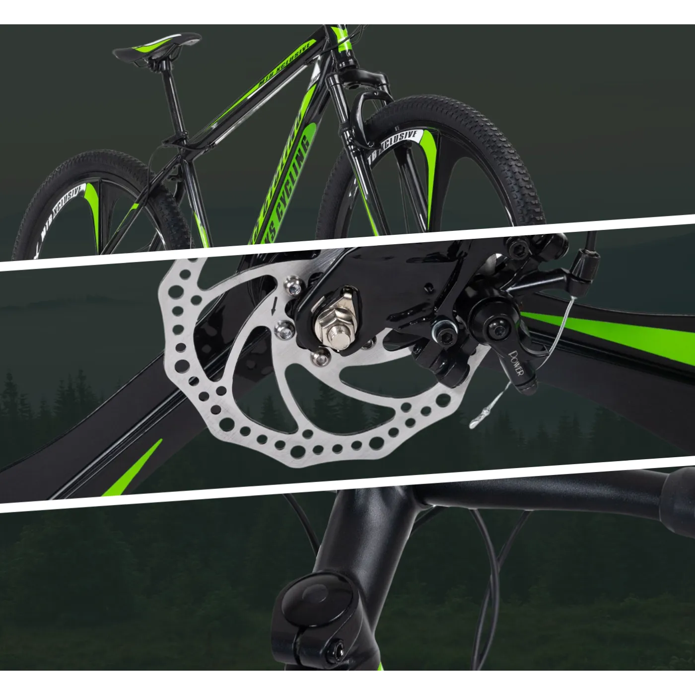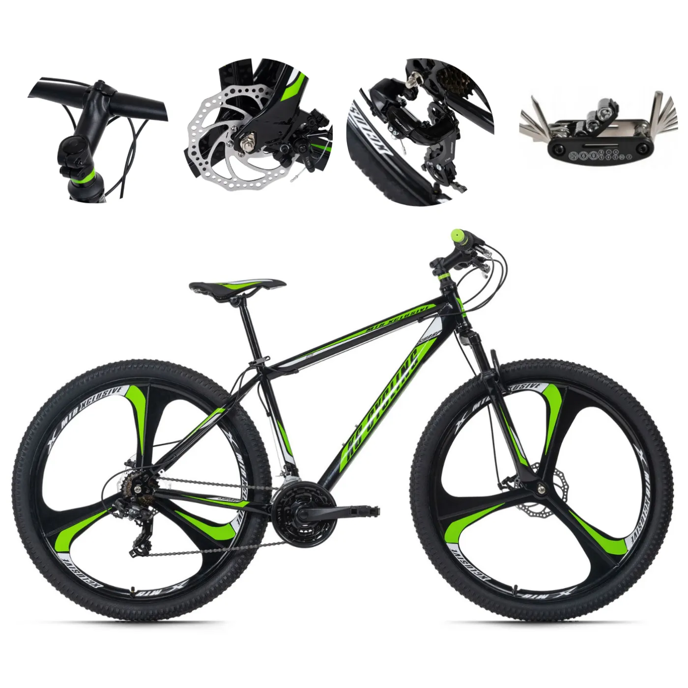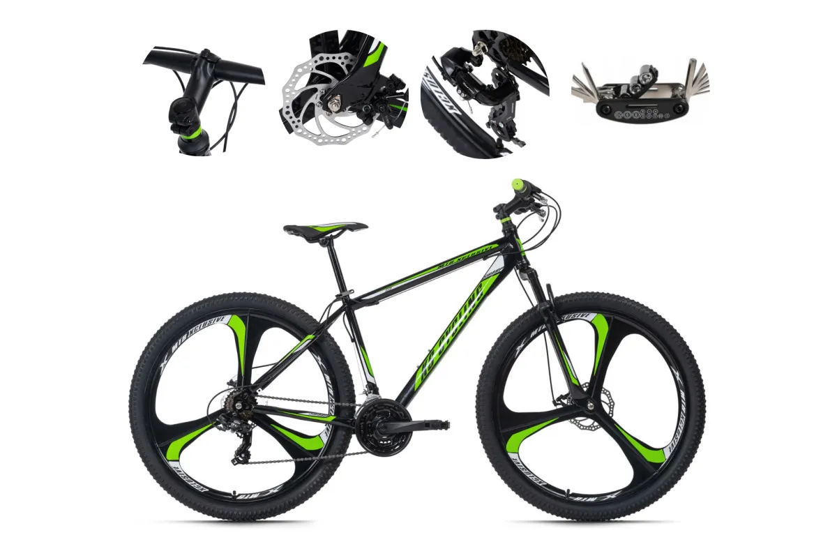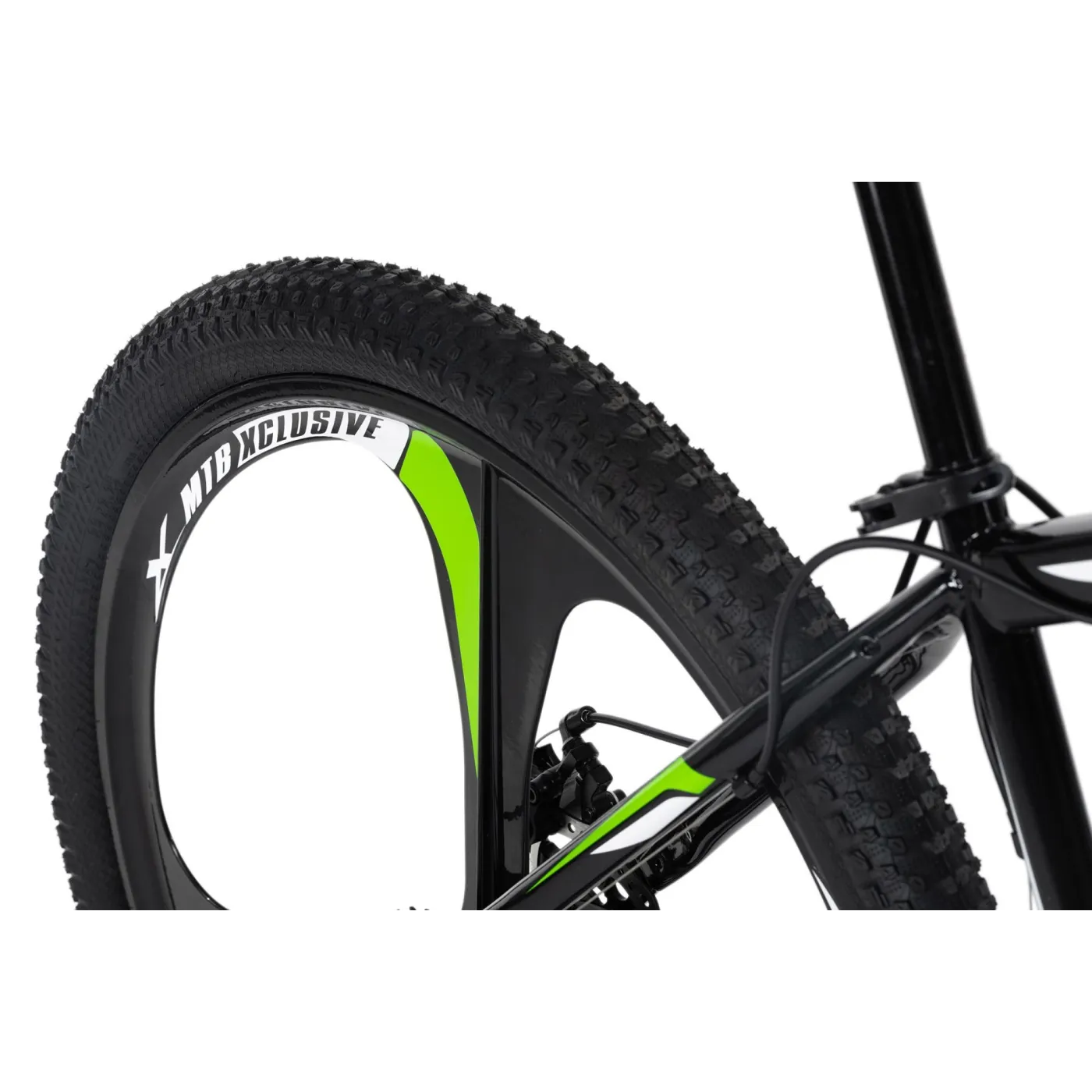 👉 Magnezowo- aluminiowe koła o rozmiarze 29" x 2.25" gwarantują stabilność i komfort podczas jazdy, a wygląd w kolorze czarnym, z białymi i zielonymi wstawkami z pewnością przyciąga spojrzenia. Dodatkowo rower wyposażony jest w dzwonek, który zwiększa bezpieczeństwo podczas jazdy w ruchu miejskim