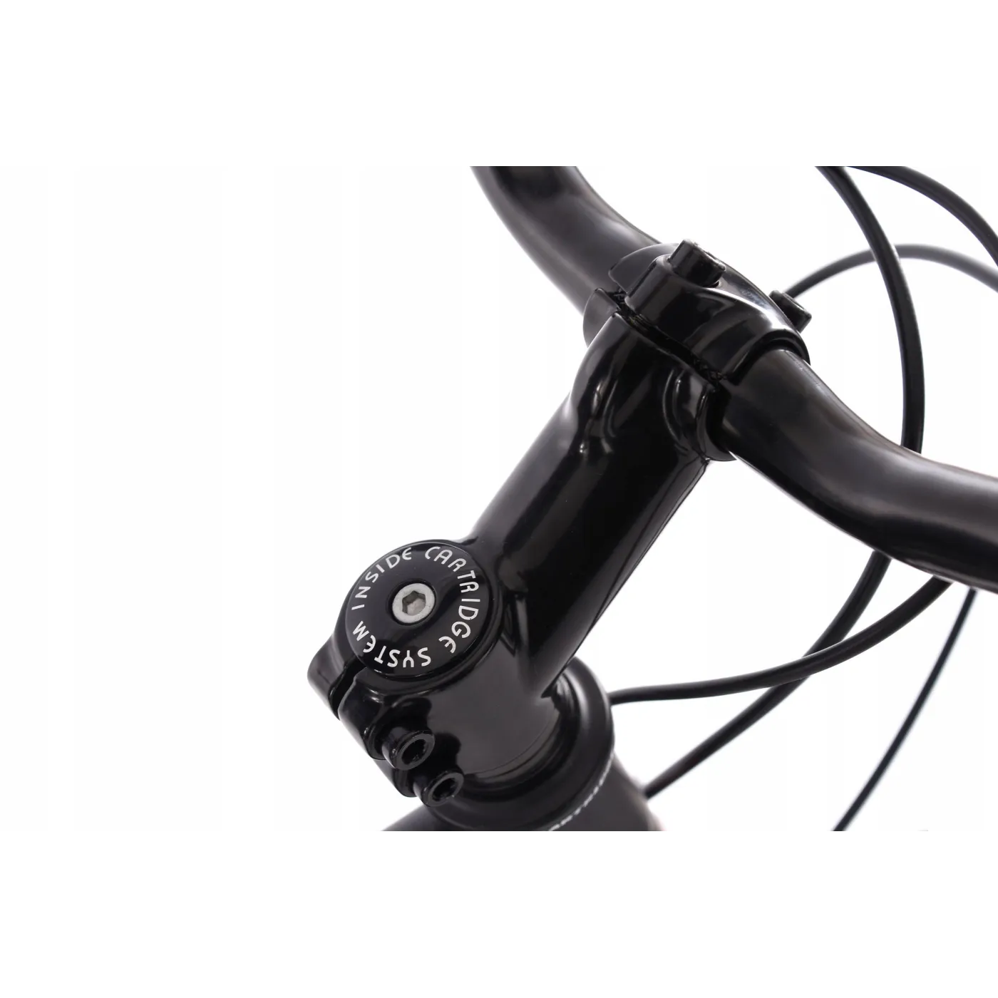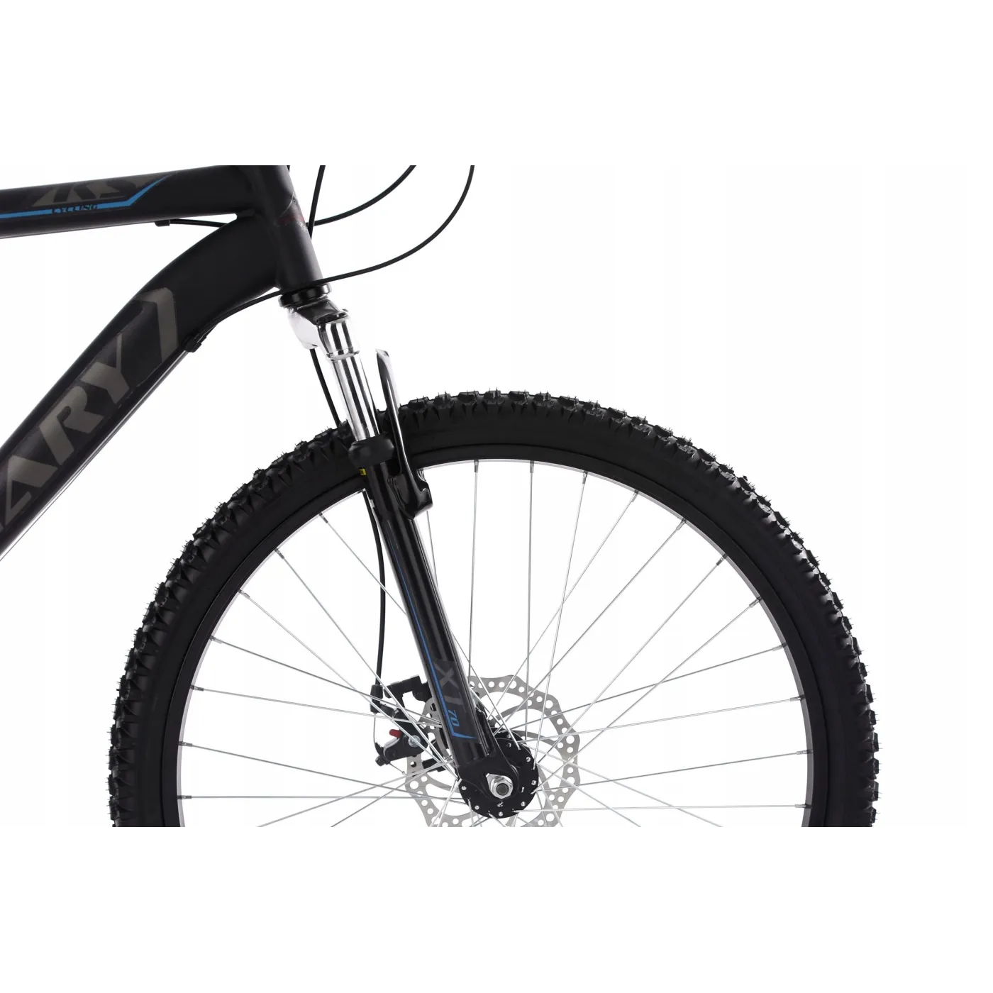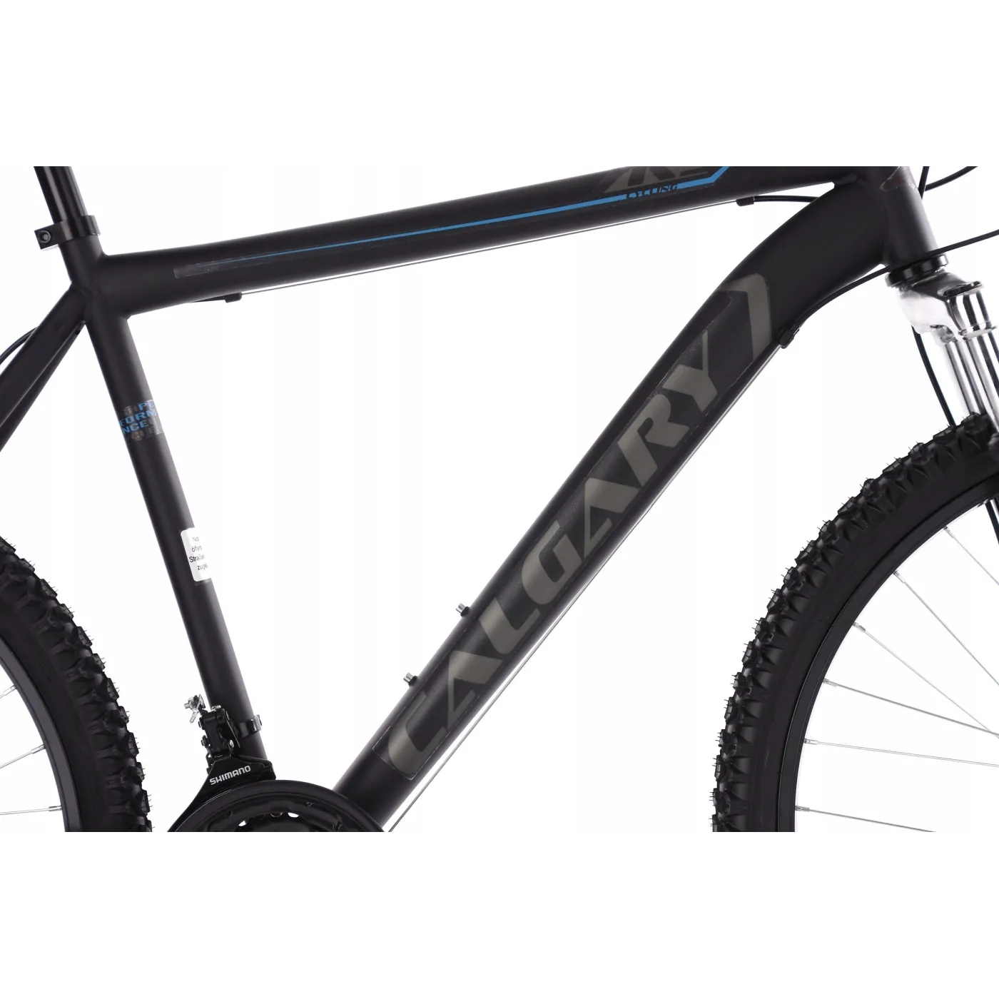 Zawsze gotowy do jazdy na pełnych obrotach - czarny rower górski CALGARY firmy KS Cycling, który doskonale komponuje się z elementami w kolorze szarym i niebieskim. Wyposażenie jest równie przekonujące. Rower posiada 21-biegową przerzutkę z obrotową manetką Shimano, która daje wygodną regulację jazdy. Mechaniczne hamulce tarczowe z przodu i z tyłu zapewniają niezbędne hamowanie.