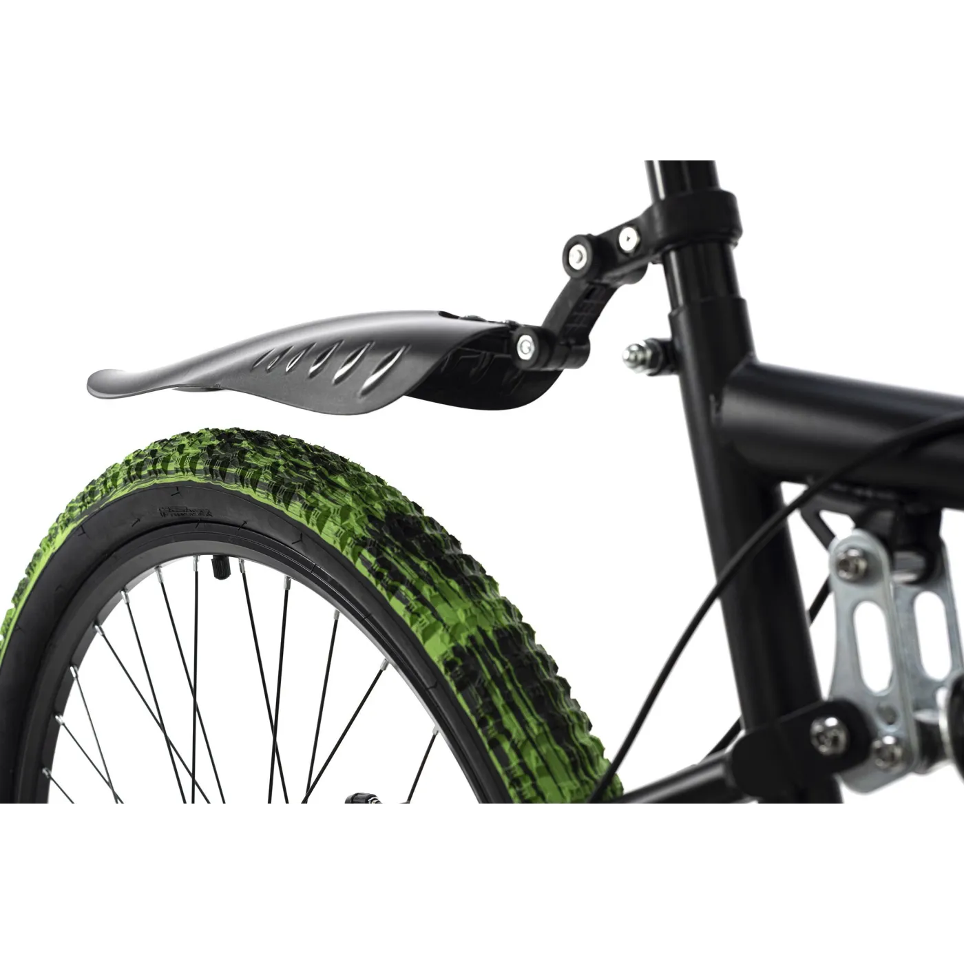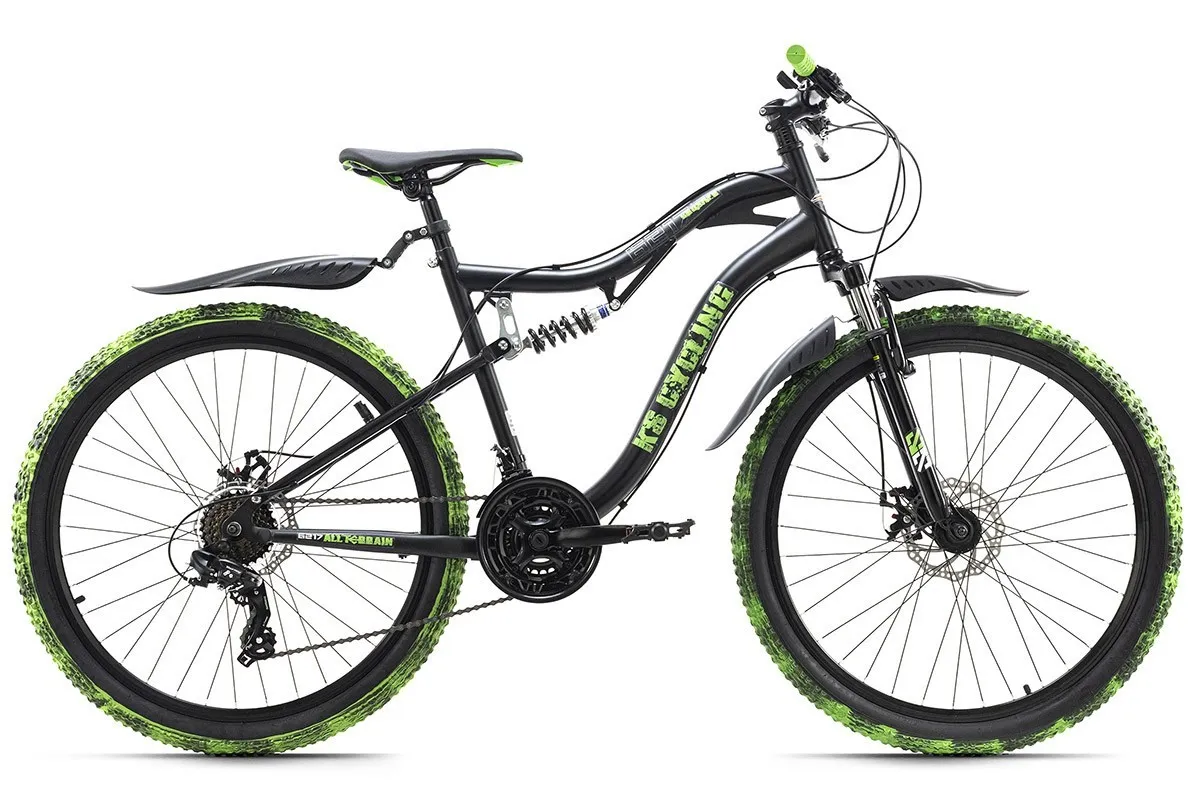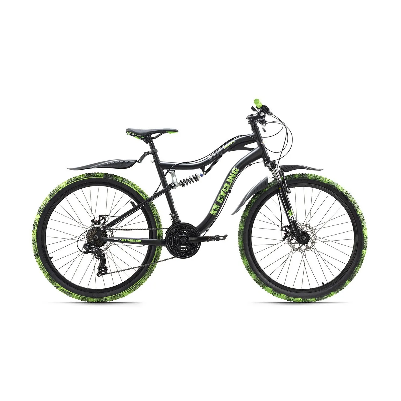 Zawsze gotowy, na nowe wzywania: w pełni amortyzowany MTB CRUSHER od firmy KS Cycling świetnie prezentuje się dzięki nietypowej geometrii ramy i detalom w kolorze neonowej zieleni.