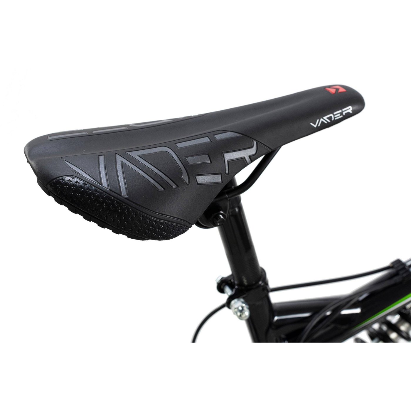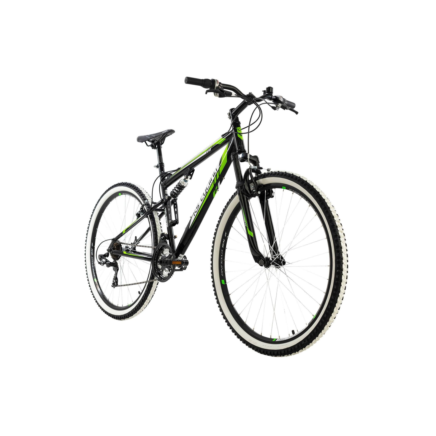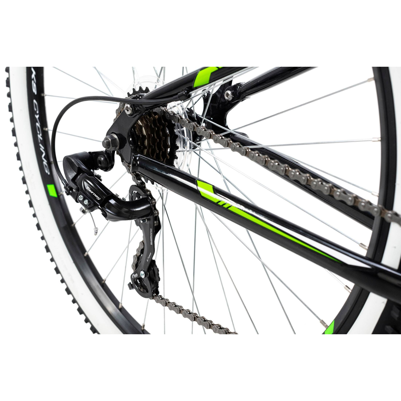 Białe i zielone akcenty na czarnej ramie o ciekawym kształcie oraz opony z białym paskiem przyciągają wzrok. Amortyzowany widelec i tylna regulowana sprężyna świetnie sobie radzą z nierównościami terenu, natomiast 21-biegowy system przerzutek SHIMANO doskonale sprawdzi się podczas wyzwań w terenie. Hamulce typu V-Brake zapewniają bezpieczne hamowanie w każdej sytuacji, a lekko profilowana kierownica sprawia, że masz dobrą kontrolę nad rowerem podczas jazdy.
