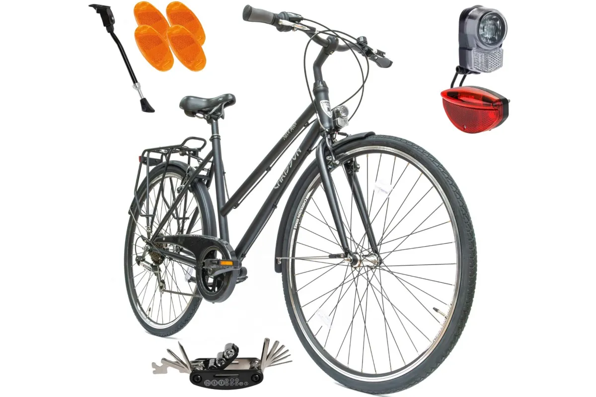 ✅ Bogate wyposażenie w standardzie - Rower gotowy do jazdy od razu po zakupie: błotniki, osłona łańcucha, bagażnik, dzwonek, oświetlenie (przód i tył), stopka i odblaski – wszystko, czego potrzebujesz w mieście.