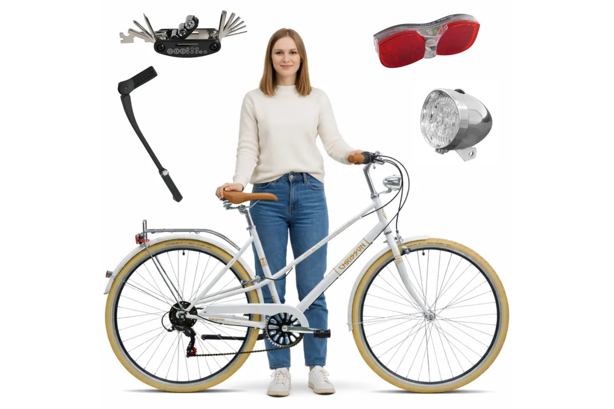 ✅ Bogate wyposażenie w standardzie - Rower gotowy do jazdy od razu po zakupie: błotniki, osłona łańcucha, bagażnik, oświetlenie (przód i tył) oraz stopka – wszystko, czego potrzebujesz w mieście.