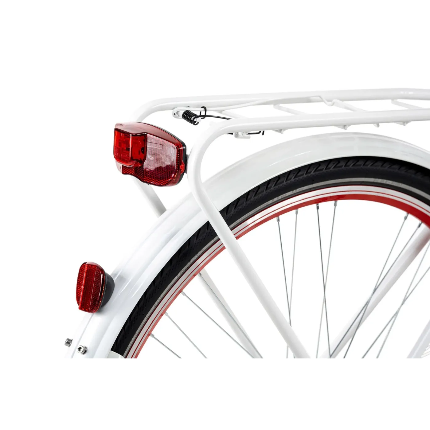 Rower wyposażony jest w niezbędne akcesoria, takie jak bagażnik, błotniki, osłonę łańcucha oraz oświetlenie, które pozwolą na bezpieczną jazdę nawet po zmroku. Pełny pakiet akcesoriów sprawia, że jest to idealny partner na codzienne wycieczki.